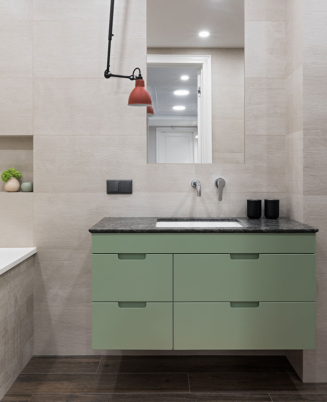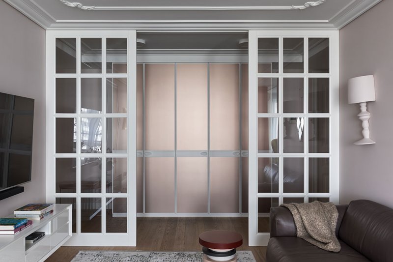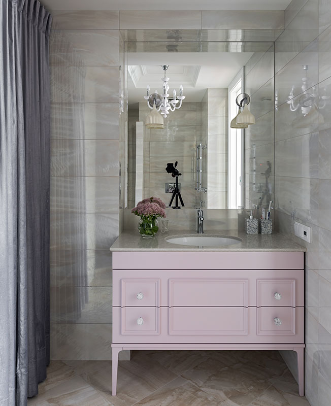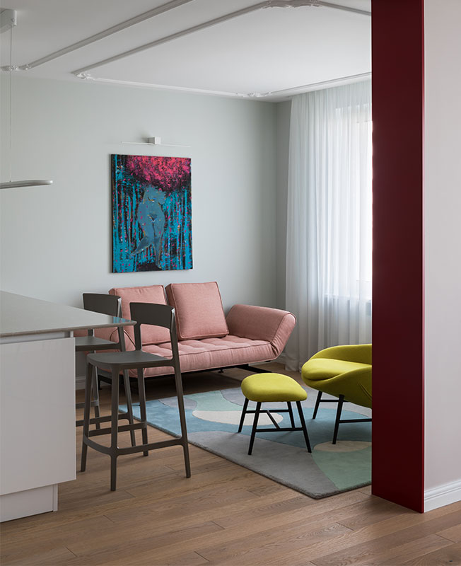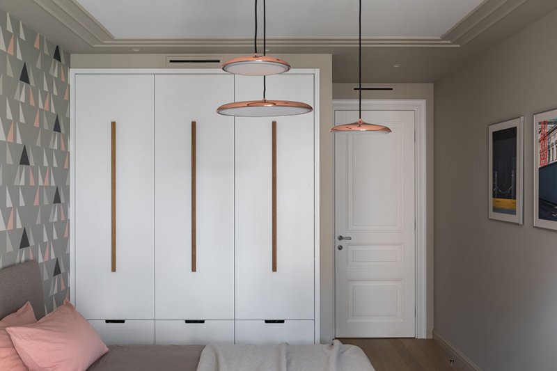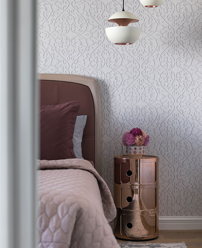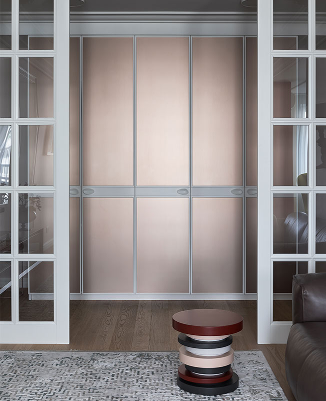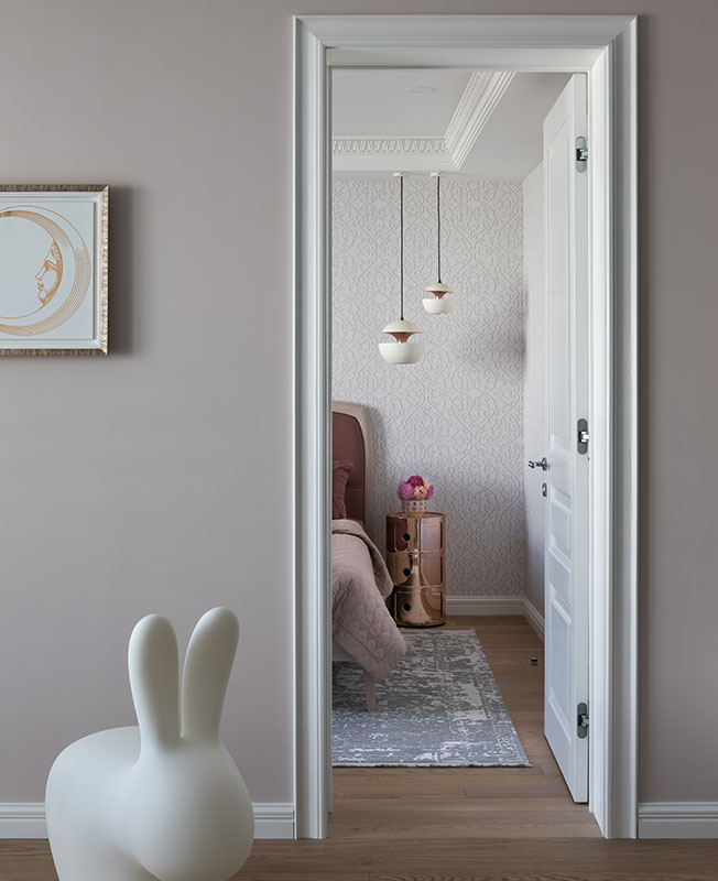 За основу колористической палитры был взят белый цвет в сочетании с пастельными пудровым и мятным. Еще одним акцентом стала медь — в культовой тумбочке Componibili Анны Кастелли Ферриери для Kartell, в светильниках в спальнях, на фасадах шкафов, в декоре гостиной.