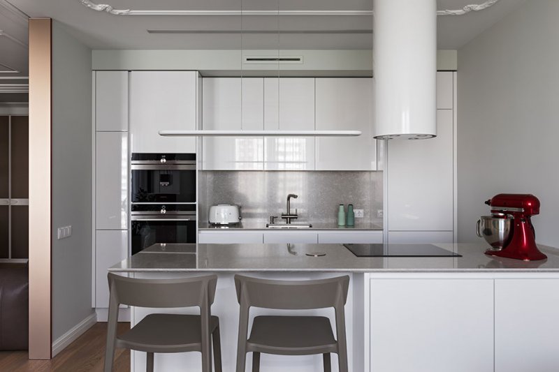 Столовая зона. Подстолье Moooi. Столешница изготовлена на заказ из кварц-композита. Стулья Sissi, диз. Людовика и Роберто Паломба, Driade. Люстра Paper Chandelier, диз. Studio Job, Moooi. Ваза на столе Calligaris. Кролик Queboo. Декор на стене Fornasetti. Растения из салона «Зеленый Олень». Дизайнер Вера Прохорова оформила квартиру 105 кв. метров в новостройке. За исключением небольшой высоты потолков помещение обладало хорошим потенциалом. Также из несомненных достоинств — большие французские окна в гостиной и комнате сына. Дизайнер хотела создать легкое и воздушное пространство с вкраплениями классики, но при этом современное. Интерьер создавался для семьи из трех человек. Младший сын-студент пока живет с родителями, а вот старший — уже отдельно, но часто приезжает в гости со своей семьей, поэтому важно было поставить большой обеденный стол. Из пожеланий заказчики высказали кухонный остров и отдельную гардеробную. Фрагмент гостиной. Шкаф изготовлен на заказ из кварц-композита. Ковер Pierre Cardin. Перепланировку провели еще на этапе строительства, согласовав ее с застройщиком. Хозяйская спальня с гардеробной и ванной комнатой разместилась в одной части квартиры, комната сына с примыкающим санузлом — в другой. Самое большое помещение в интерьере — объединенная кухня-гостиная. Гостиная. Диван Theca. Подстолье Moooi. Столешница изготовлена на заказ из кварц-композита. Стулья Sissi, диз. Людовика и Роберто Паломба, Driade. Люстра Paper Chandelier, диз. Studio Job, Moooi. Ваза на столе Calligaris. Кролик Queboo. Точкой притяжения общей зоны стал большой обеденный стол с легкими стульями от Driade. Людовика и Роберто Паломбо вдохновлялись венскими стульями из гнутой древесины. Их легким изогнутым силуэтам созвучна люстра по дизайну Studio Job для Moooi, которая также переосмысливает классический архетип. Кухня Nolte. Барные стулья Calligaris. Диван Innovation Living. Светильник Grok. На стене работа белорусской художницы Галины Лазарчик. Гостиная. Диван Theca. Шкаф и тумба под ТВ изготовлены на заказ из кварц-композита. Настенный светильник Karman. Краска Little Greene. Паркетная доска Xilo 1934. Кухня Nolte. Барные стулья Calligaris. Светильник Grok. Краска Little Greene. Детская. Кровать Nakts Mebeles. Стул Belleville, диз. Ронан и Эрван Буруллеки, Vitra. Светильники Nordlux. Обои Scion. Стеллаж и ковер Ikea. Настольный светильник Aromas del Campo. На столе фотография Дмитрия Войновского. Детская. Кровать Nakts Mebeles. Светильники Nordlux. Обои Scion. Шкаф изготовлен на заказ по эскизам автора проекта. Для отдыха в объединенном пространстве сразу две зоны — с большим диваном напротив панели ТВ и рядом с кухней с компактной мягкой группой. Продолжают тему классики в современном прочтении молдинги на потолках, обои и плитка от Марселя Вандерса, настенные светильники Karman в гостиной, напоминающие лепнину. Спальня. Кровать Nakts Mebeles. Светильники Here Comes the Sun, диз. Бертран Бала, DCW editions. Тумбочки Componibili, диз. Анна Кастелли Ферриери, Kartell. Обои по дизайну Марселя Вандерса Graham
