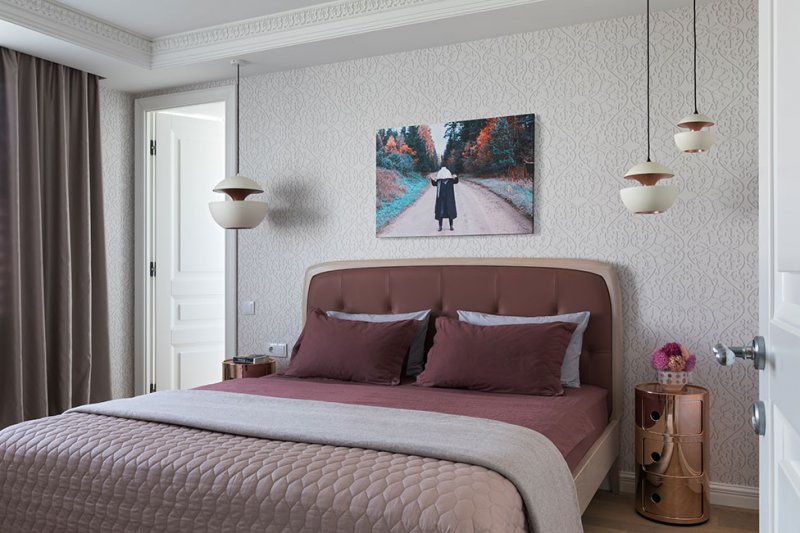 Спальня. Кровать Nakts Mebeles. Светильники Here Comes the Sun, диз. Бертран Бала, DCW editions. Тумбочки Componibili, диз. Анна Кастелли Ферриери, Kartell. Обои по дизайну Марселя Вандерса Graham & Brown. На стене фотография «Марс» Юлии Мацкевич.
