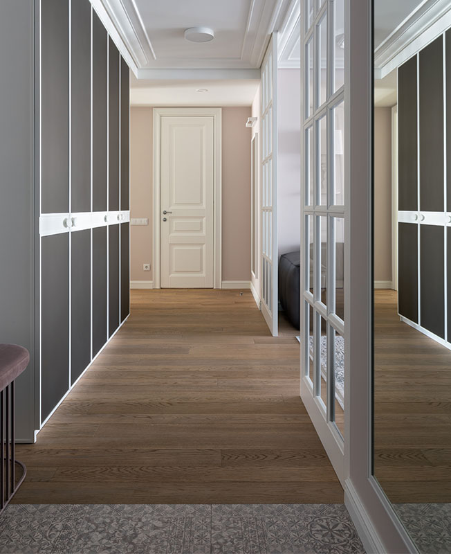 Интерьер создавался для семьи из трех человек. Младший сын-студент пока живет с родителями, а вот старший — уже отдельно, но часто приезжает в гости со своей семьей, поэтому важно было поставить большой обеденный стол. Из пожеланий заказчики высказали кухонный остров и отдельную гардеробную.