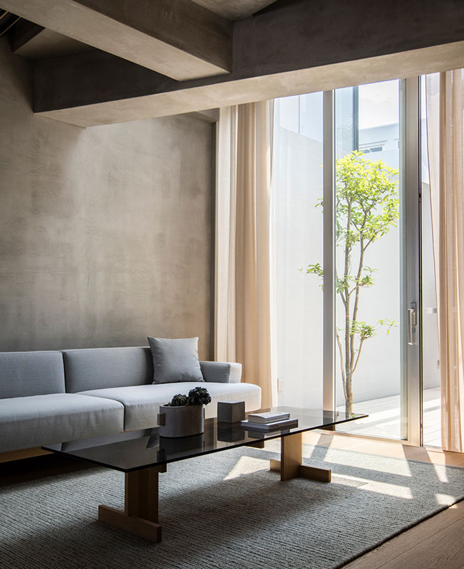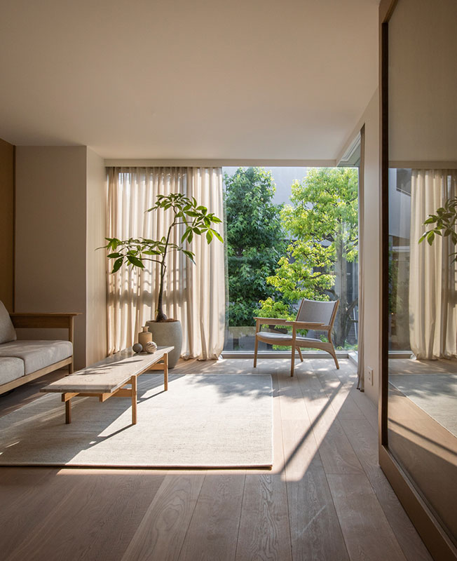 Природа чувствует себя интегрированной в квартиру из комнат, выходящих во двор, и вы не можете понять, что находитесь в таком огромном городе, как Токио. Это делает апартаменты уникальными, предлагая своим жителям очень мирное и гармоничное домашнее окружение.