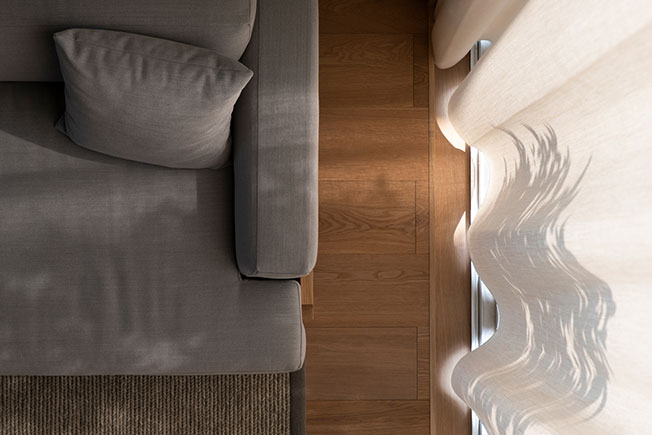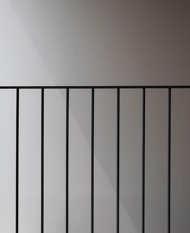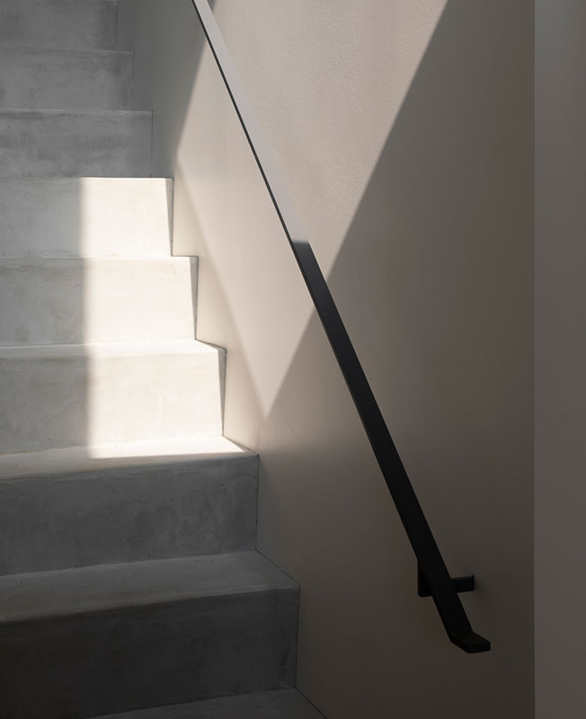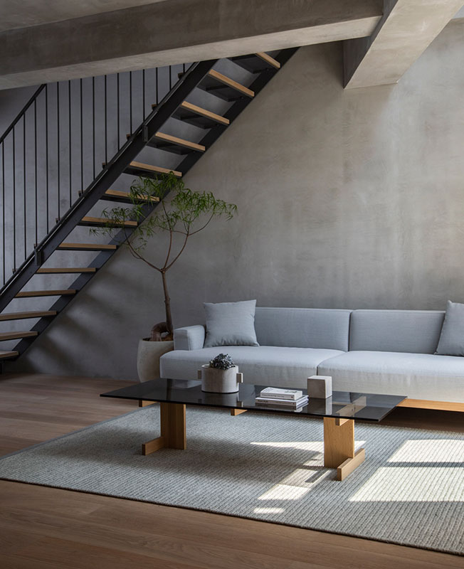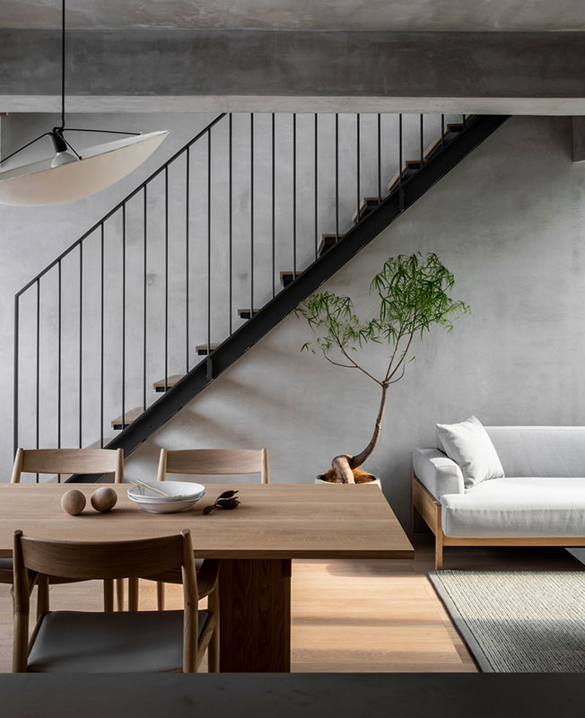 Каждое пространство было разработано так, чтобы воздух и свет проходили сквозь него, создавая естественный поток по всей квартире. Работая с пространствами двойной высоты и большими окнами дизайнеры создали повторяющиеся элементы ради успокаивающего ощущения. Лестницы, перила и стеновые панели имитируют дорожки внутреннего двора, и аналогичный архитектурный подход был воплощен в предметах мебели.