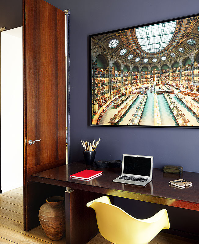В доме дизайнера Дидье Гомеза. ТВ-гостиная служит также кабинетом. Письменный стол изготовлен на заказ из венге по эскизам Д. Гомеза. Рабочее кресло, диз. Ч. И Р. Имз, Vitra. Над столом фото К. Хёфер. Слева японский глиняный горшок XIX в. Дверь ведет в гостиную.