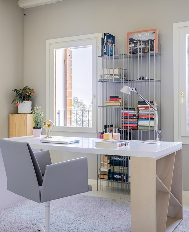 Диана Клементе, основатель агентства DNKЕY, оформила свой дом в провинции Тревизо. Комната дочери. Письменный стол Casamania & Horm, cтеллаж Mogg, кресло Baleri Italia. Настольная лампа Tolomeo Микеле де Лукки — классика итальянского дизайна от Artemide.