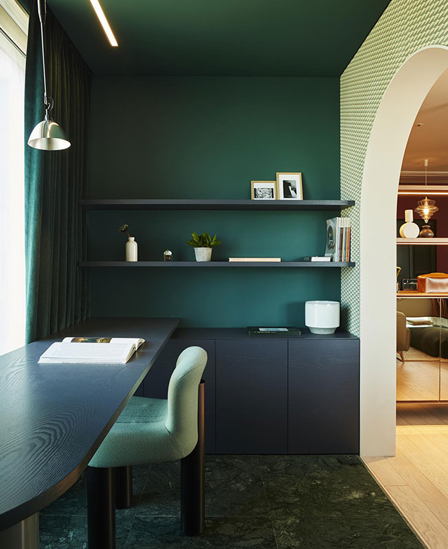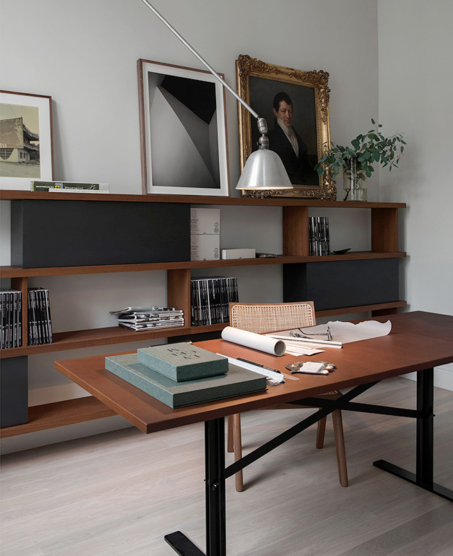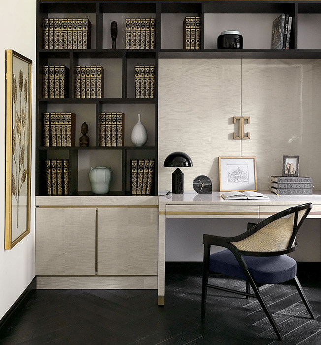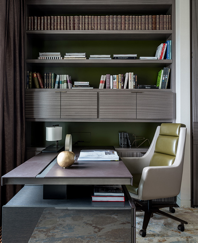 Проект компании Woodstone и архитектора Йоко Танабе — квартира в Гранатном переулке площадью 240 кв. метров, московский pied-a-terre для семьи коллекционеров. Кабинет. Письменный стол Poltrona Frau, кресло Promemoria. Библиотека изготовлена на заказ. Отделка: серый махагон и оливковая эмаль, бронзовые ручки.