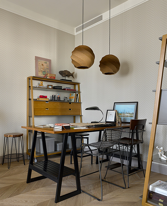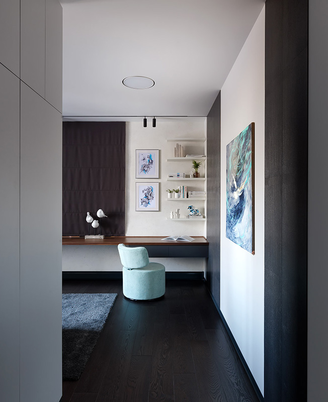 Квартира в ЖК «Родной город» на западе Москвы — работа молодого архитектурного бюро Archslon. Авторский коллектив: Татьяна Осецкая, Александр Салов, Татьяна Юдина, Ксения Ваучская. Кабинет. Стул Julia Group. Корпусная мебель: индивидуальное изготовление, PM-Studio. На полу инженерная доска Finex.