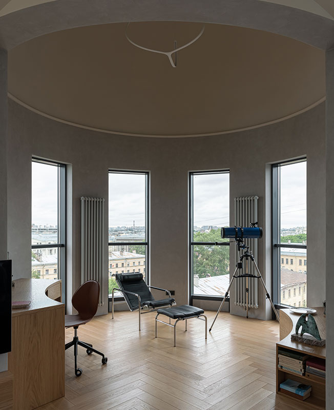 Заказчики — ученый и владелица коммуникационного агенства, мечтали жить в центре Санкт-Петербурга рядом с Таврическим садом, видом на Смольный собор, возможно на последнем этаже и с собственной террасой. Заказчики обратились за помощью к другу семьи Вячеславу Хомутову, шефу–архитектору бюро Haubaus. Над проектом Хомутов работал в дуэте с Марией Аршанской. Кабинет. Кресло с банкеткой Genni, диз. Габриэле Муччи, Zanotta. Рабочее кресло Basil, Calligaris.