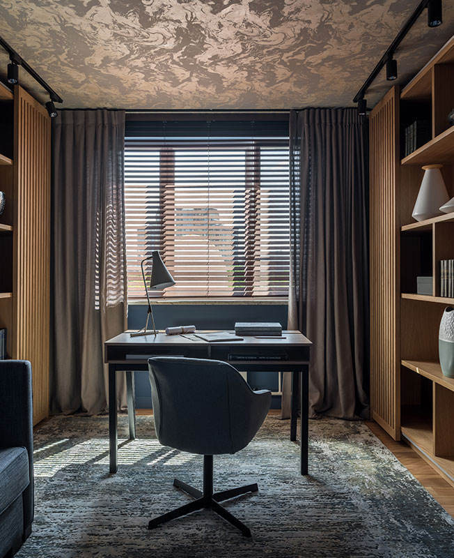 Дизайнер Ольга Луис оформила четырехкомнатную квартиру в типовом панельном доме на Юге Москвы. Интерьер площадью 102 кв. метра создавался для молодой активной семьи из Японии, которая планировала следующие десять лет проводить в Москве не больше шести месяцев в год. Кабинет. Текстиль и жалюзи, ANDY textile. Потолок расписан вручную. Письменный стол и библиотека выполнены на заказ по эскизам дизайнера. Настольный светильник, La Redoute.