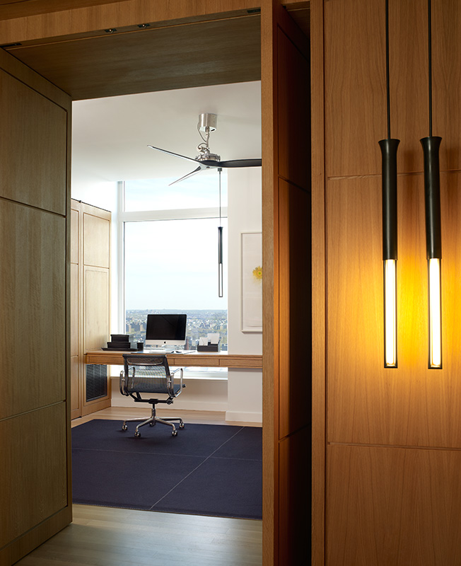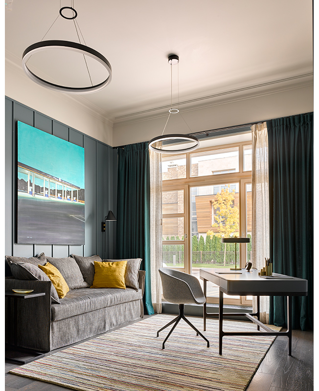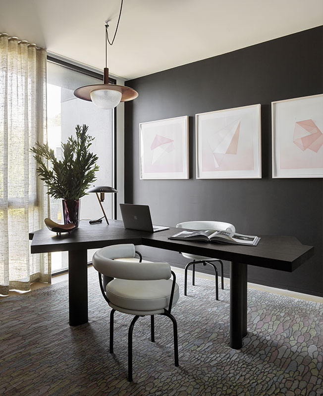 Архитекторы студии Artechnology спроектировали пентхаус в Хамовниках. Присоединив часть открытой террасы, получили жилье внушительной площади: 370 кв. метров. Кабинет. На столе лампа Lumina. Cтул Domitalia. Ковер, Jerome Botanic.