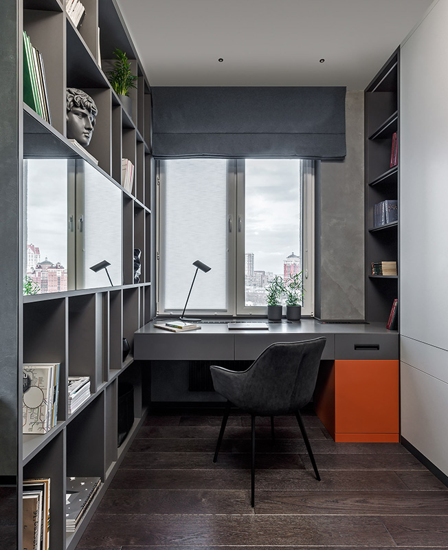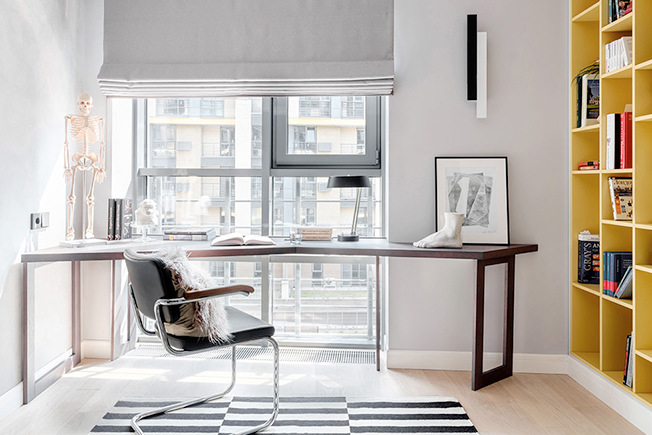 Идеальная место для рабочего места — перед окном. В этом случае столу достанется максимальное количество дневного освещения. В маленьких квартирах используют широкий подоконник как продолжение поверхности стола. Или оформляют оконные проемы конструкцией со стеллажами.