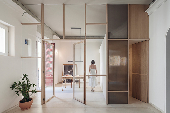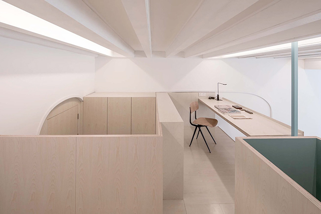 Эта квартира площадью 42 кв. метра расположена на первом этаже здания, построенного в 1930-х, во времена французской концессии в Шанхае. Проект Atelier tao + c. Верхняя часть многофункциональной фанерной конструкции образует спальню и кабинет со встроенным матрасом и угловым письменным столом.