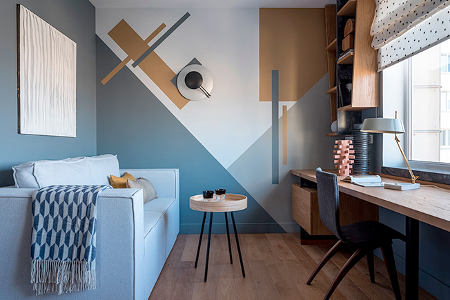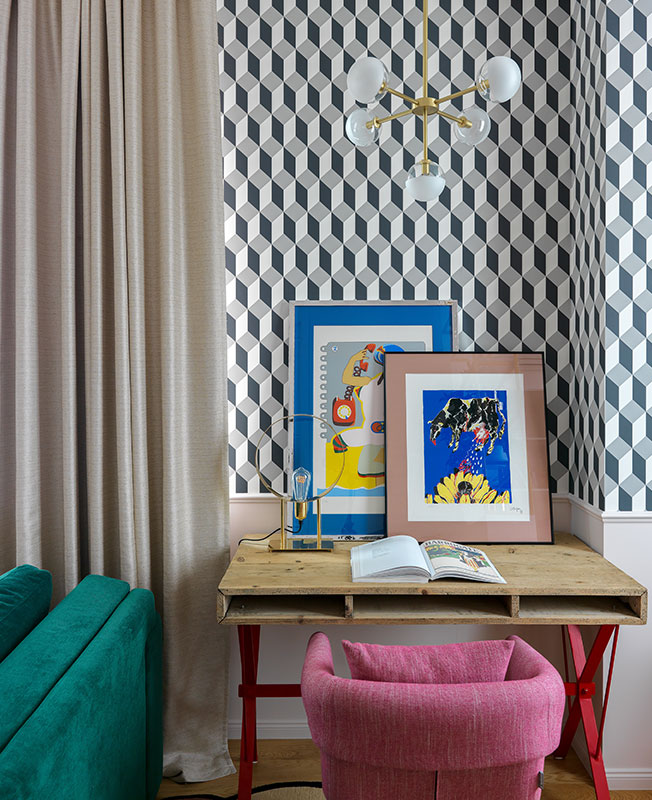 Екатерина Бегичева оформила интерьер для молодого человека в новом доме на Беговой. Рабочая зона. Стена расписана в стилистике авангарда по эскизам автора проекта. Настенный светильник: винтаж, галерея Lamps of 50–60–70s. Рабочий стол и стеллаж изготовлены на заказ по эскизам автора проекта, арт-студия Something Good. Над диваном панно, диз Ирина Маркман, галерея ArtBrut Moscow.
