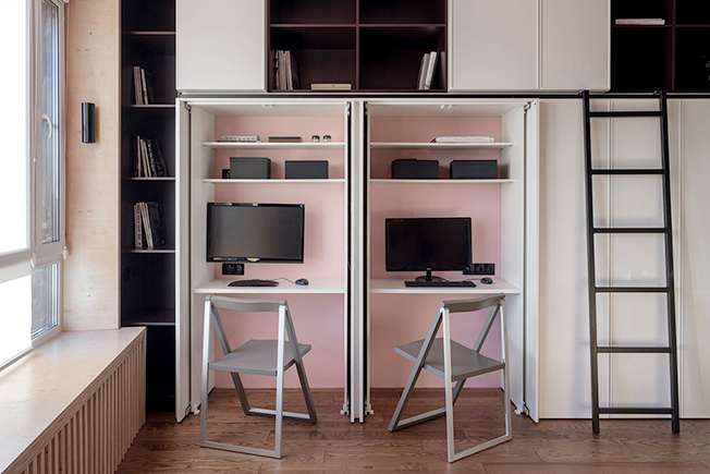 Компактная квартира-студия в Москве площадью 28 кв. метров — собственное жилье Яны и Юрия Волковых, которое дизайнеры оформили для себя. Рабочие места расположили за поворотно-сдвижными фасадами.