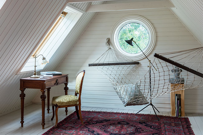 Дом фотографа Михаила Степанова стоит в стародачном поселке Клязьма, где сохранилось несколько дач по проекту архитектора Кекушева. На втором этаже оборудовали спальню и кабинет с библиотекой и гамаком. Многие предметы в доме Михаил сделал сам: он сам мастерит, восстанавливает и переделывает, иногда тратя на это целые годы. Например, стеллажи для книг в кабинете или журнальные столики в гостиной.