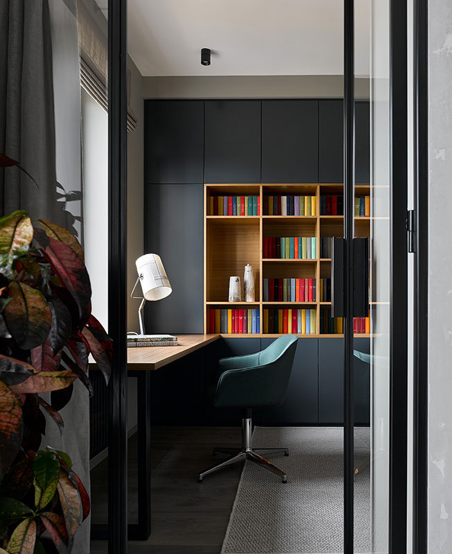 Команда студии Aiya Design спроектировала трехкомнатную квартиру для молодого мужчины, который живет один. Кабинет. Стеклянная перегородка, Loffi. Библиотека, мастерская Belado. Вазы, Иван Беляев. Рабочее кресло, Vitra.