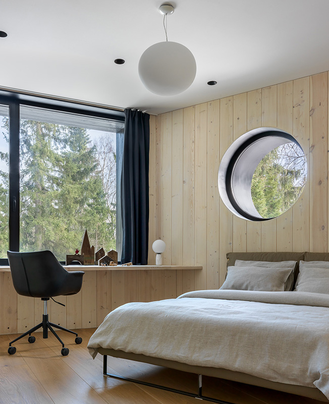 Проект Le Atelier: деревянный дом в Подмосковье. Одна из спален на среднем уровне. Окно-иллюминатор — такое же, как в холле. Черный кант подчеркивает форму. Рабочая поверхность сделана во всю длину окна из того же материала, что и стены.