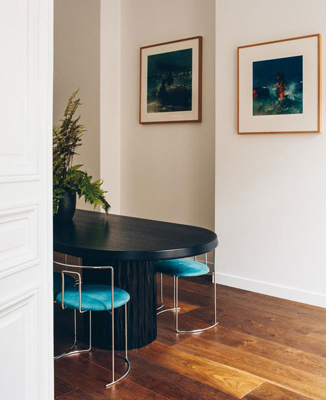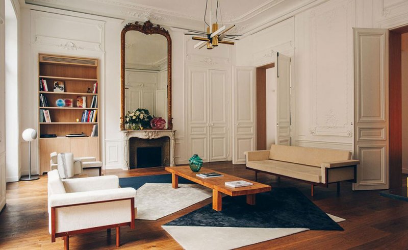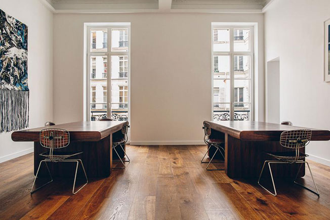 Обстановка может похвастаться несколькими стульями Traineau, первоначально спроектированными в 1976 году для Центра Помпиду, и массивными минималистскими винтажными столами из Французской национальной библиотеки.