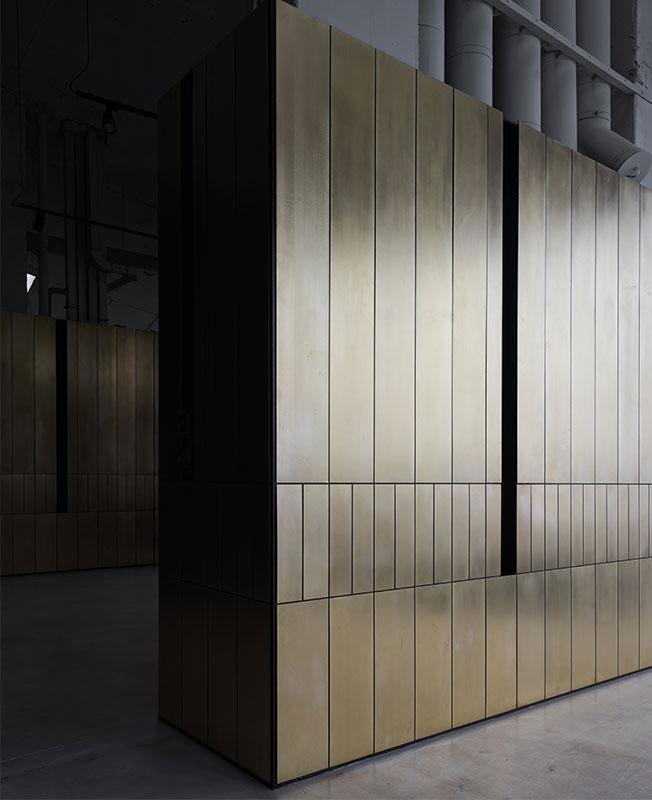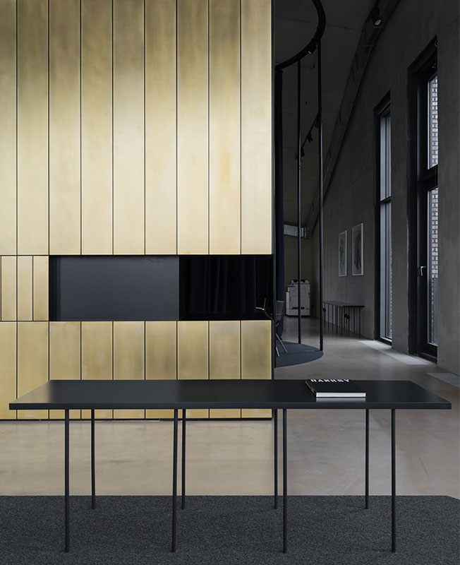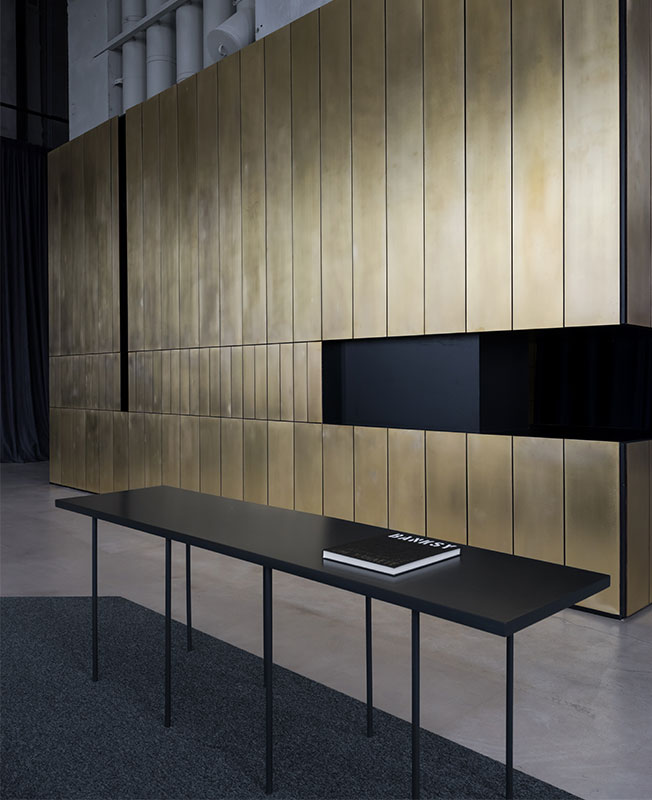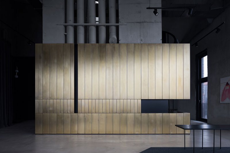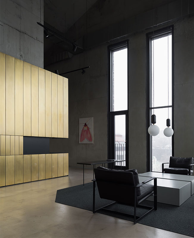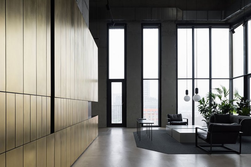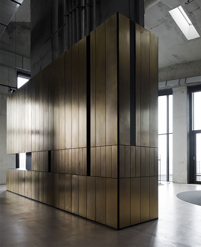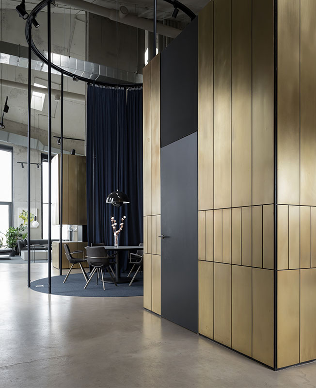Чтобы не возводить лишних стен и не лишать помещение простора, его зонировали двумя многофункциональными боксами. В них разместили необходимые технические и утилитарные помещения — кухню, санузел и системы хранение для офиса. Облицованные крупными латунными панелями и притягивающие взгляд, боксы за счет высоты 3,5 метра также поддерживают прием сбивки масштаба.