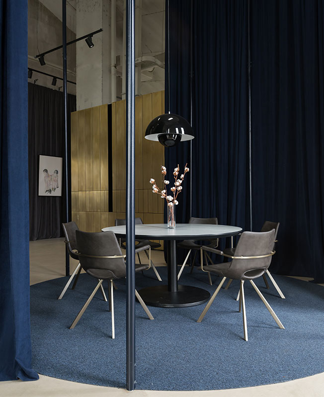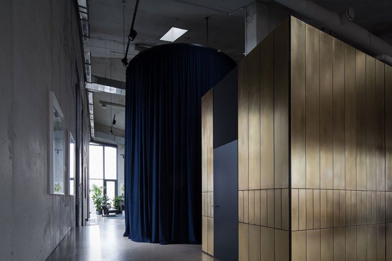 Ротонда переговорной притягивает взгляд за счет работы с масштабом — это концептуальный прием всего проекта. Шторы из тяжелого синего бархата, расположенные по периметру ротонды на пятиметровой высоте, позволяют создать более уединенную обстановку для разговора с клиентом.