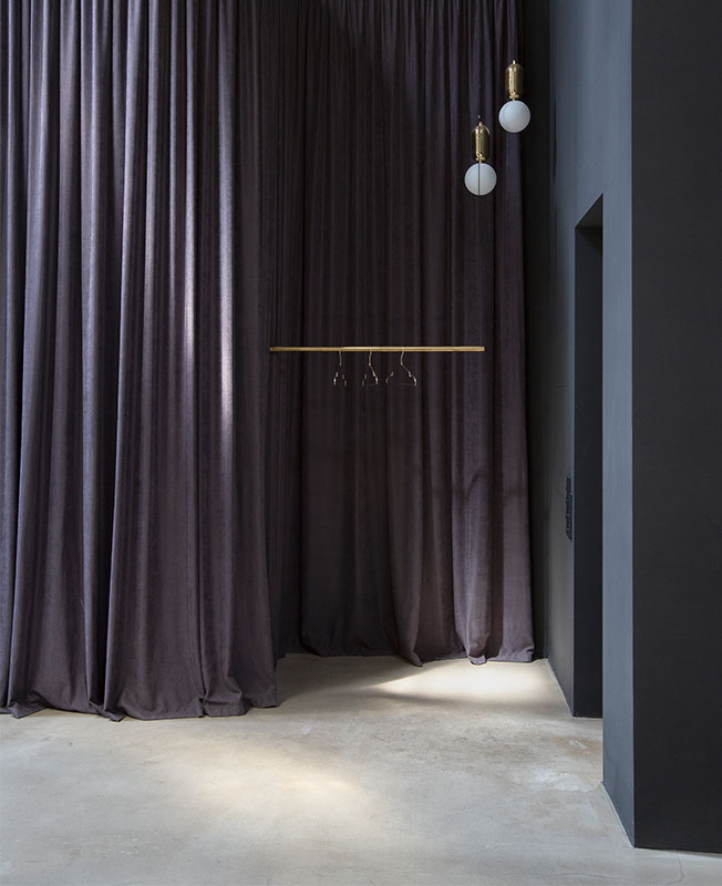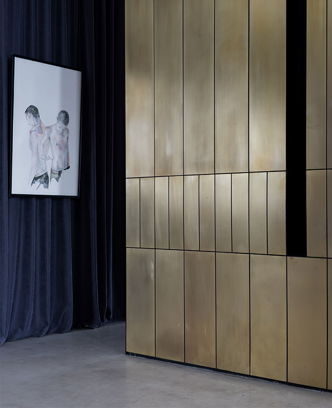 Архитекторы Александр Волков, Наталья Семчишина, Юлия Петрова и Филипп Гончаренко (Volkov Architects) спроектировали офис продаж жилого комплекса NV/9 Artkvartal в Москве. Офис площадью 180 кв. метров находится на Серебрянической набережной, в пентхаусе современного жилого дома. Изначально это было просторное, светлое помещение с бетонными стенами и панорамными окнами с видом на Яузу. Одна из его особенностей — нестандартная форма двускатного потолка высотой до 8,5 метров. nonehttps://www.instagram.com/volkov_architects/https://www.facebook.com/volkovarchitects/www.volkov-architects.com Перед архитекторами стояла задача спроектировать «нестандартное, эффектное и репрезентативное пространство офиса, учитывая исходную уникальность площадки». Интерьер поделили на три основные зоны: гостиную с макетом, ротонду-переговорную и офис для сотрудников. Макет жилого комплекса в зоне гостиной — центральный элемент пространства. Его значимость подчеркивает изготовленный по эскизу архитекторов светильник, состоящий из 25-ти ламп периметрального освещения, который контрастирует с общим акцентным светом. Ротонда переговорной притягивает взгляд за счет работы с масштабом — это концептуальный прием всего проекта. Шторы из тяжелого синего бархата, расположенные по периметру ротонды на пятиметровой высоте, позволяют создать более уединенную обстановку для разговора с клиентом. Чтобы не возводить лишних стен и не лишать помещение простора, его зонировали двумя многофункциональными боксами. В них разместили необходимые технические и утилитарные помещения — кухню, санузел и системы хранение для офиса. Облицованные крупными латунными панелями и притягивающие взгляд, боксы за счет высоты 3,5 метра также поддерживают прием сбивки масштаба. Мебель и аксессуары подбирали так, чтобы их линии и материалы гармонично сочетались с фактурой бетонной оболочки. Отсюда тонкие профили предметов, высокие, словно театральные, тканевые драпировки на стенах и ковры лаконичной формы, которые дополнительно помогают зонировать пространство. Некоторые предметы, включая стол для макета, столы-«многоножки» и светильник над макетом, выполнены на заказ по эскизам авторов проекта, чтобы подчеркнуть индивидуальность интерьера. Главным его украшением стали произведения современных художников Вари Щуки, Анны Беляковой, Анны Диричевой и Houdini.