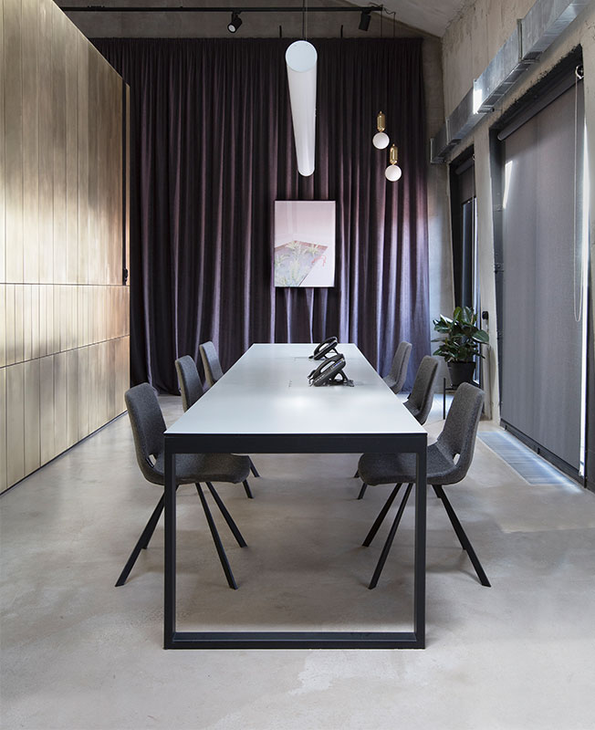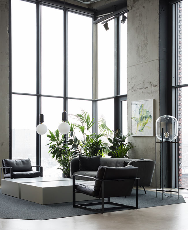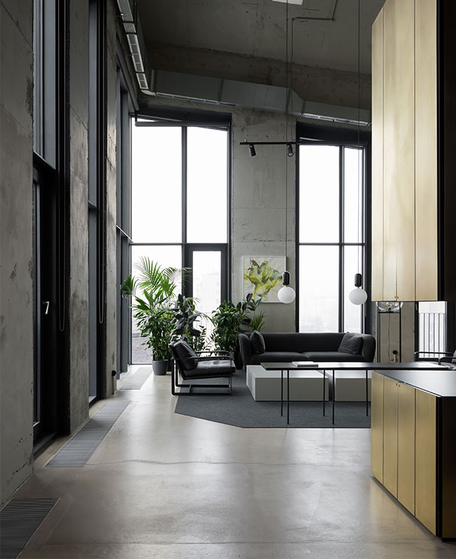 Офис площадью 180 кв. метров находится на Серебрянической набережной, в пентхаусе современного жилого дома. Изначально это было просторное, светлое помещение с бетонными стенами и панорамными окнами с видом на Яузу. Одна из его особенностей — нестандартная форма двускатного потолка высотой до 8,5 метров.