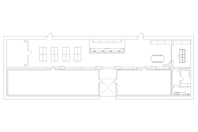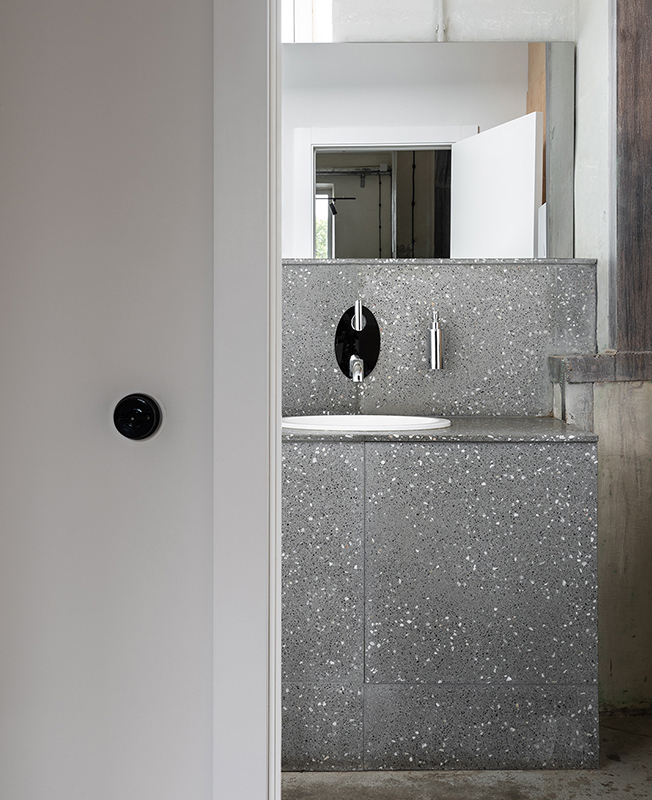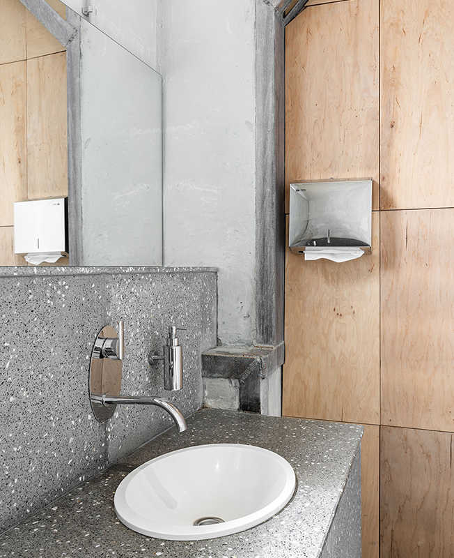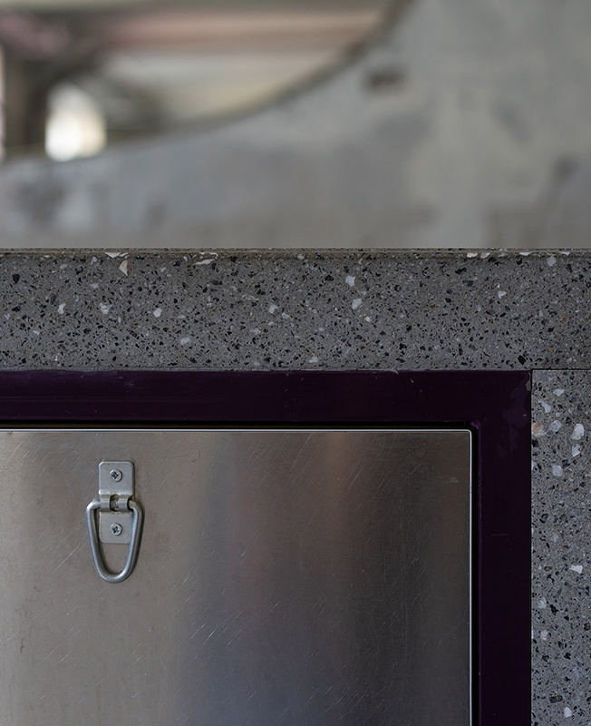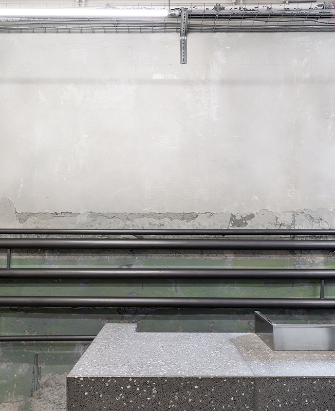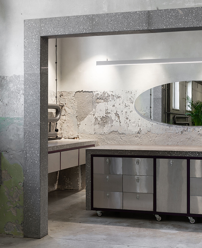 Общее освещение в зале — это просто светодиодные трубки, свисающие с потолка, каждая на отдельном проводе. Проводка была сделана без разрушения стен и укладки кабелей в лотки. Свет и расстановка мебели подчеркнули длину ангара. Вся мебель выполнена из нержавеющей стали и облицована серыми плитами тераццо, выполненными на заказ.