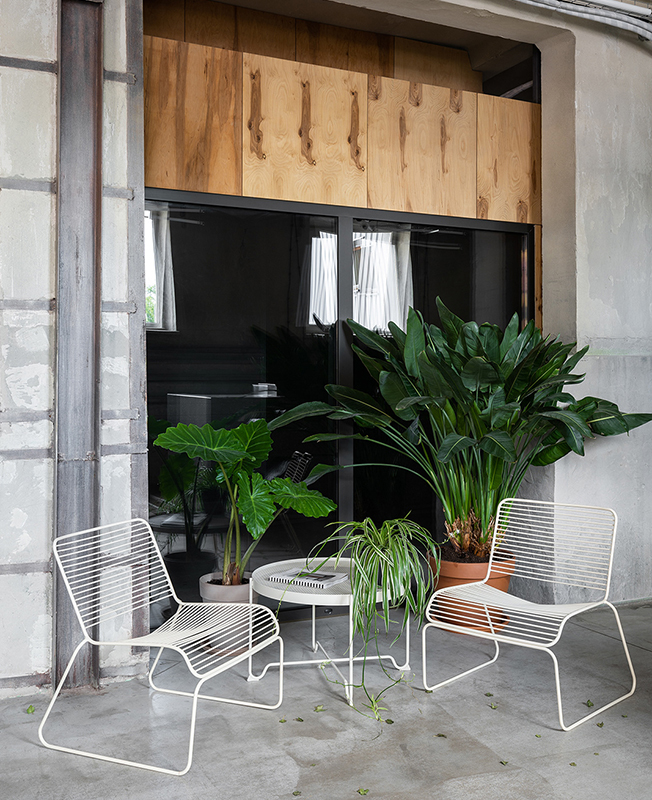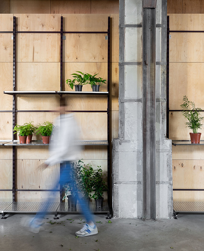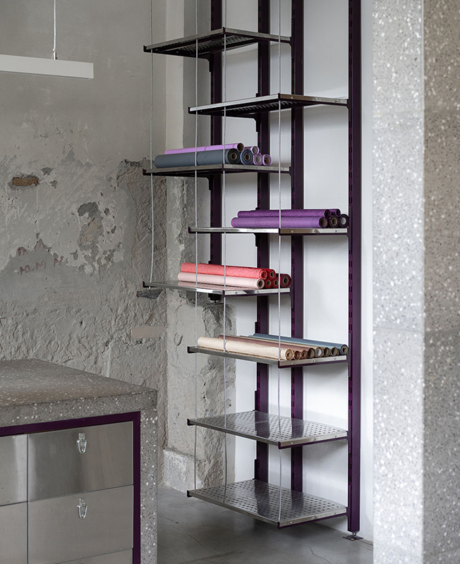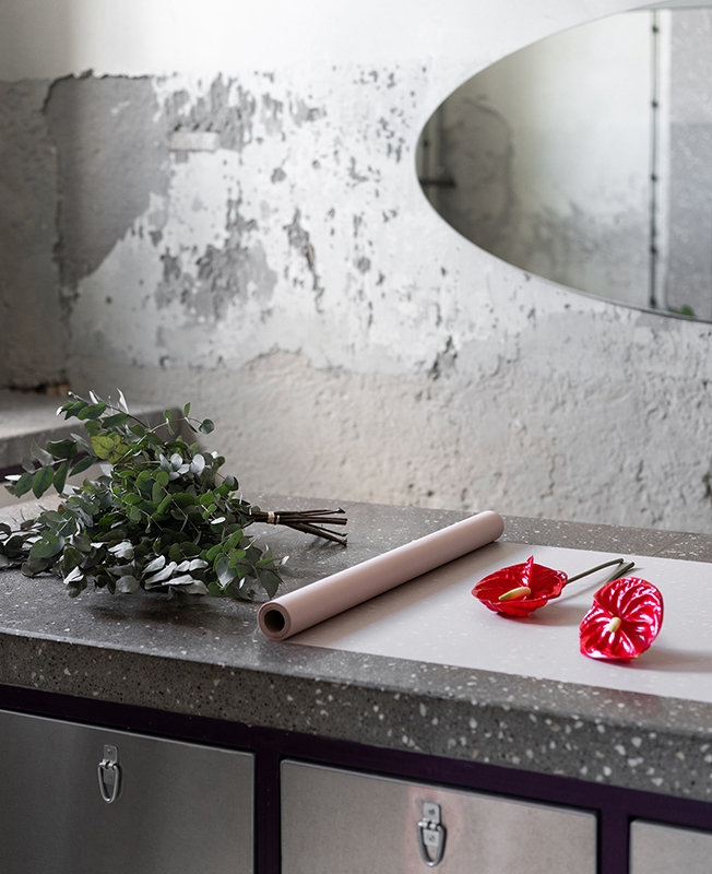 Над столом находится лампа с рассеивателем для комфортной работы. Продукция размещена вокруг гостевой зоны, чтобы посетители могли ее выбрать. Для перевозки цветов были разработаны мобильные полки. Они изготовлены со специальной фрезеровкой, что позволяет быстро менять высоту крепления. Для них использовалась черная перфорированная нержавеющая сталь.
