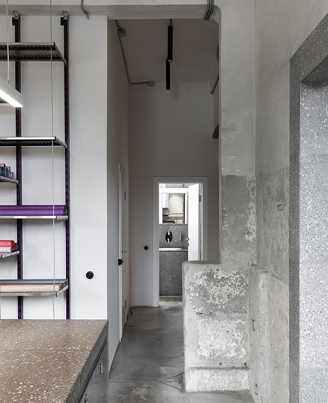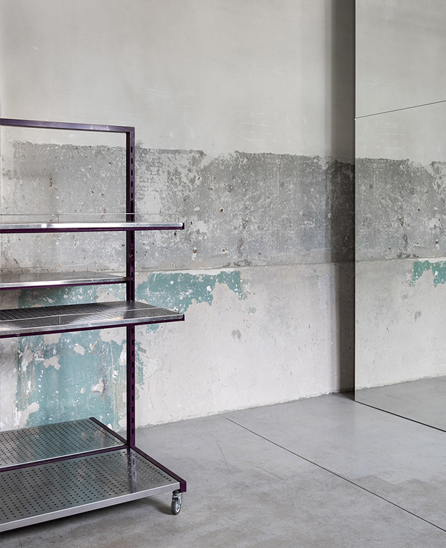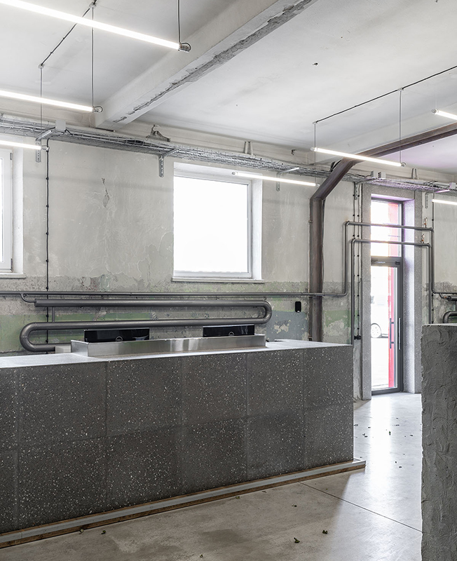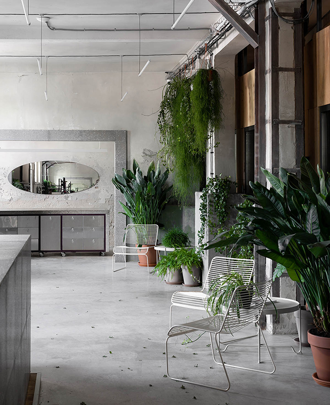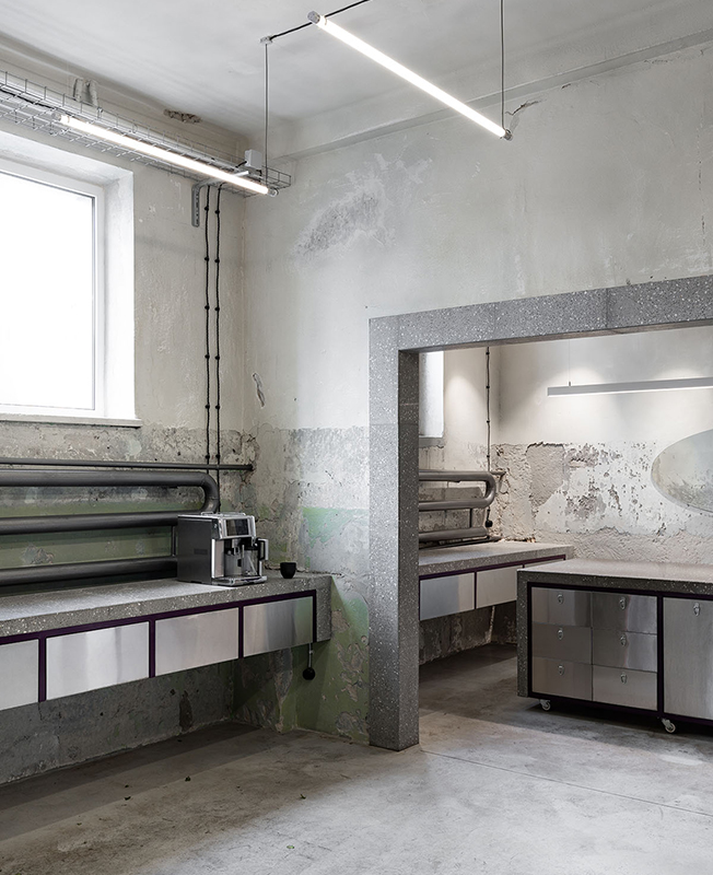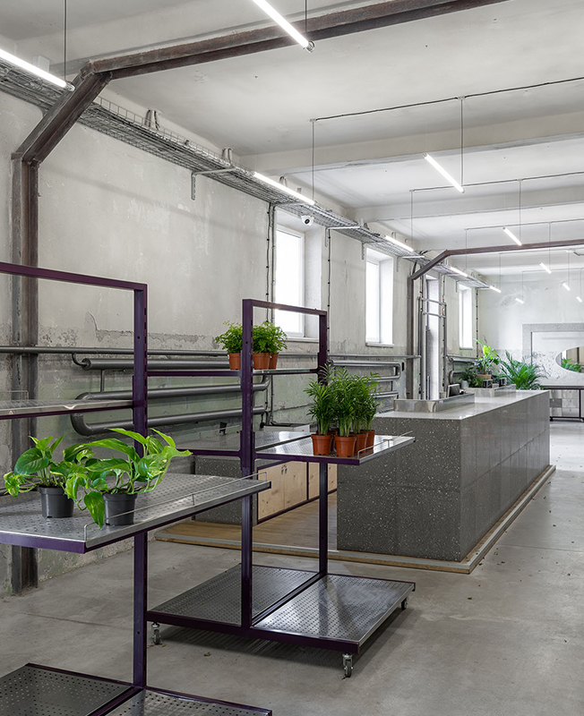 Rina Lovko Studio, украинская студия Рины Ловко спроектировала цветочный шоурум в Киеве. Клиент Dicentra заказал переделать бывший склад советских времен в новое торговое помещение. Нужно было спроектировать витрины холодильников со срезанными цветами для розничной продажи. А также место для срезанных цветов и растений в горшках для оптовой продажи. В зале требовались рабочие места для менеджеров и флористов, подсобные помещения с кухней и общий туалет для гостей и персонала. Ангар представлял собой 300 кв. м открытого пространства без перегородок. «Ограниченный бюджет, большая площадь и сжатые сроки создавали сложные условия, которые требовали нестандартных решений, — рассказывает Рина Ловко. —Помещение просто разделили двумя стенами, колонны находятся посередине. Пол был асфальтовым, и поэтому мы решили залить его бетоном. Верхняя часть стен была побелена, а нижняя часть была окрашена зеленым маслом. Краску удалили вместе с штукатуркой, а затем покрыли грунтовкой и слоем глазури. Стены вышли текстурированными. Идея состояла в том, чтобы все выглядело нетронутым — как будто мы вошли, расставили мебель, и магазин начал работать. В общем, пространство выглядит как большой ангар, в который были вставлены два маленьких кубика. Между кубиками есть дорожка для больших разгрузочных тележек. Напротив — широкий прием для четырех человек. Мы должны были сделать холодильники меньшего размера. Для витрины мы изготовили алюминиевое раздвижное окно с датчиками движения. Внутри холодильники окрашены в графитовый цвет. Решение состоит в том, чтобы сделать продукт привлекательным, разместив цветы на черном фоне. Так они выглядят яркими и контрастными, тем самым помогая продажам. Мы подкрепили эту идею специально подобранным освещением, чтобы цветы выглядели еще ярче. Общее освещение в зале — это просто светодиодные трубки, свисающие с потолка, каждая на отдельном проводе. Проводка была сделана без разрушения стен и укладки кабелей в лотки. Свет и расстановка мебели подчеркнули длину ангара. Вся мебель выполнена из нержавеющей стали и облицована серыми плитами тераццо, выполненными на заказ. Неожиданный пункт в списке задач — офис для менеджеров. Решением было сделать офис полностью зеркальным и поместить его в складское помещение, как третий куб. Его края не доходят до стен, чтобы не повредить коммуникации. Зеркало, следовательно, визуально увеличило пространство и выглядит так, как будто длинный ангар увеличился по площади. Углы мебели были обрезаны под 45 градусов. Стол двусторонний, с ящиками и мусорными баками с обеих сторон. Тяжелый столик установили на колесики, поэтому его можно перемещать. Над столом находится лампа с рассеивателем для комфортной работы. Продукция размещена вокруг гостевой зоны, чтобы посетители могли ее выбрать. Для перевозки цветов были разработаны мобильные полки. Они изготовлены со специальной фрезеровкой, что позволяет быстро менять высоту крепления. Для них использовалась черная перфорированная нержавеющая сталь. Еще один оттенок — пурпурный, был выбран, чтобы разбавить металлический фон. Главный вход сделан из красной перфорированной сетки, над ней мы разместили неоновую вывеску. На фоне индустриальной зоны это очень заметно, что опять же выгодно с точки зрения розничных продаж».