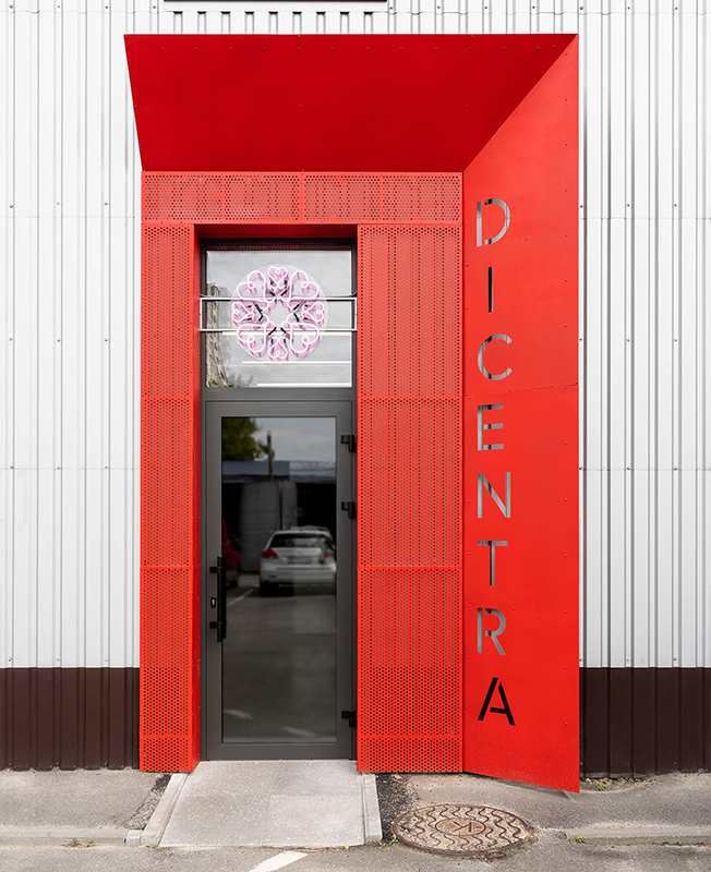 Еще один оттенок — пурпурный, был выбран, чтобы разбавить металлический фон. Главный вход сделан из красной перфорированной сетки, над ней мы разместили неоновую вывеску. На фоне индустриальной зоны это очень заметно, что опять же выгодно с точки зрения розничных продаж».