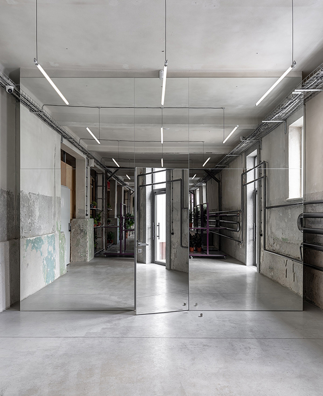 Неожиданный пункт в списке задач — офис для менеджеров. Решением было сделать офис полностью зеркальным и поместить его в складское помещение, как третий куб. Его края не доходят до стен, чтобы не повредить коммуникации. Зеркало, следовательно, визуально увеличило пространство и выглядит так, как будто длинный ангар увеличился по площади.