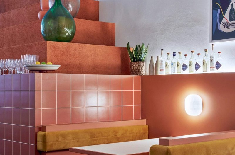 Доминирующий цвет интерьера — терракотово-оранжевый. Это имитация цвета мексиканской пустыни. В свою очередь, ступенчатость и многоуровневость (в качестве примера — стеллаж для напитков) — отсылка к архитектурному стилю, характерному для мексиканского полуострова Нижняя Калифорния. В числе других деталей — керамические вазы, много зеленых растений в горшках и минималистичные тканые панно и картины на стенах. Их заказчик привез с собой из путешествий по Мексике.