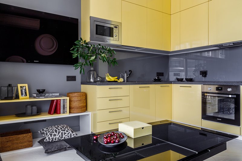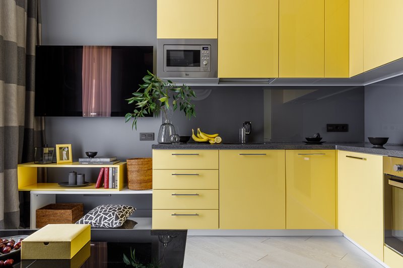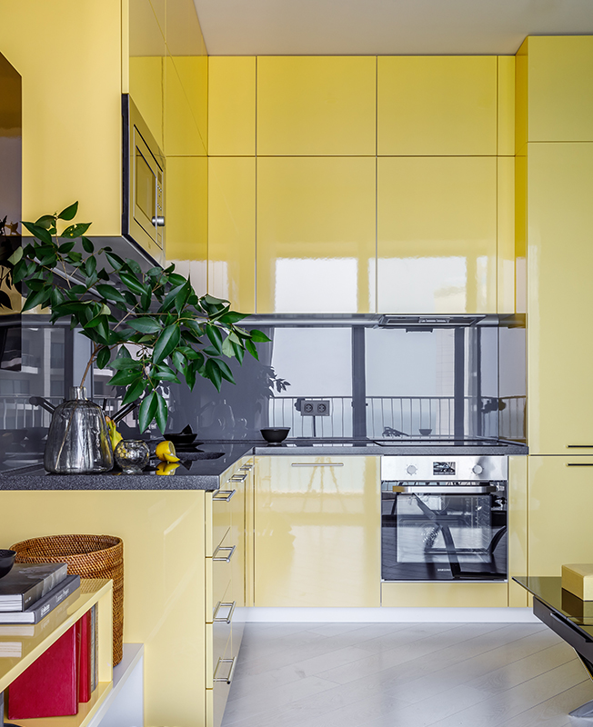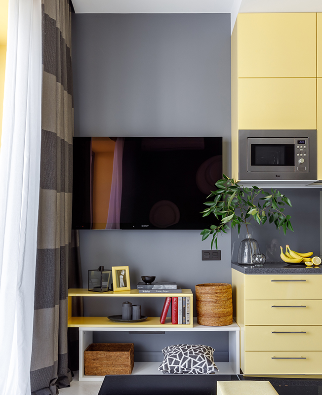 Зона кухни-гостиной. Кухня создана на заказ по эскизам архитектора. На стенах краска Caparol. Декор ZaraHome. Архитектор Елена Паунич оформила апартаменты в центре Сочи, на 16-м этаже жилого комплекса «Актер Гэлакси». Единое пространство разделила на два, предназначенных для сдачи в аренду. nonehttps://www.instagram.com/jpaunic/https://www.facebook.com/profile.php?id=1284290329http://www.jpaunic.ru/ «Заказчица — успешная бизнес-леди, — рассказывает Елена. — Решила вложить капитал в интересный проект, который будет ей приносить прибыль. Интерьер создавался под сдачу отдыхающим и с возможностью в будущем выставить апартаменты на продажу. Зона кухни-гостиной. Кухня создана на заказ по эскизам архитектора. Декор ZaraHome. Зона кухни-гостиной. Кухня создана на заказ по эскизам архитектора. На стенах краска Caparol. Декор ZaraHome. Проект начинали с пустой бетонной коробки. Необходимо было разделить площадь 100 кв. метров вместе с балконом на два отдельных апартамента по 50 кв. метров, с общей прихожей. На одной из первых встреч с заказчицей сошлись во мнении, что интерьер делаем ярким и стильным. Желтый оказался ее любимым цветом, в компаньоны ему выбрали благородный нейтральный графитный. Зона кухни-гостиной. Кухня создана на заказ по эскизам архитектора. На стенах краска Caparol. Декор ZaraHome. Зона кухни-гостиной. Кухня создана на заказ по эскизам архитектора. На стенах краска Caparol. Декор ZaraHome. Главной задачей было эргономично использовать пространство, чтобы вписалось все, что нужно для комфортного проживания семьи на отдыхе. Зона гостиной запланирована у окна с выходом на балкон и прекрасным видом на море. Гостиная совмещена с полноценной кухней, здесь же раскладной диван, стол-трансформер. Есть отдельное помещение под гардеробную с прачечной, вход в которую замаскирован дверью со скрытым коробом и окрашен в серый цвет стен. Спальня расположена справа от входа в нише и отделена от коридора легкой шторой. Ванная комната минимальных размеров оформлена в графитных тонах, как весь интерьер. Из-за небольшого расстояния между кроватью и входом в ванную комнату использовали дверь-книжку фабрики «Софья». Зона спальни. Кровать «Орматек». Тумба создана на заказ по эскизам архитектора. Свет Centrsvet. На стенах краска Caparol. Декор ZaraHome. Под тумбой в спальне подняли подиум и обошли его плинтусом. Там прошли коммуникационные трубы, которые невозможно было утопить в полу. Зона спальни. Кровать «Орматек». Тумба создана на заказ по эскизам архитектора. Свет Centrsvet. На стенах краска Caparol. Декор ZaraHome. Мебель выбирали функциональную и лаконичную. Журнальный стол трансформируется в полноценный обеденный. Раскладной диван образует дополнительное спальное место. Кухня с высокими шкафами до потолка обеспечивает место для хранения. Кровать с мягким изголовьем удачно встала в нишу. На полу качественный ламинат под выбеленный дуб. Светлый цвет и диагональная укладка визуально увеличили пространства. Стены и плинтуса окрашены в один тон — белый и графитный». Гардеробная с прачечной. Гардеробная с прачечной. Санузел. Мебель, сантехника, плитка Porcelanosa. Свет Centrsvet. Санузел. Мебель, сантехника, плитка Porcelanosa. Свет Centrsvet. Санузел. Мебель, сантехника, плитка Porcelanosa. Свет Centrsvet. Санузел. Мебель, сантехника, плитка Porcelanosa. Свет Centrsvet.