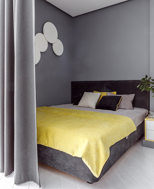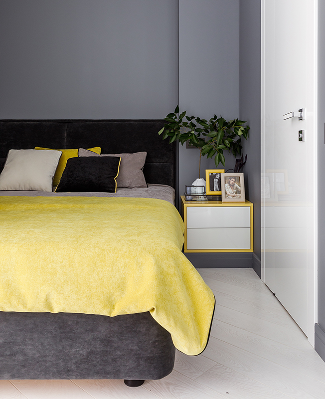Проект начинали с пустой бетонной коробки. Необходимо было разделить площадь 100 кв. метров вместе с балконом на два отдельных апартамента по 50 кв. метров, с общей прихожей. На одной из первых встреч с заказчицей сошлись во мнении, что интерьер делаем ярким и стильным. Желтый оказался ее любимым цветом, в компаньоны ему выбрали благородный нейтральный графитный.