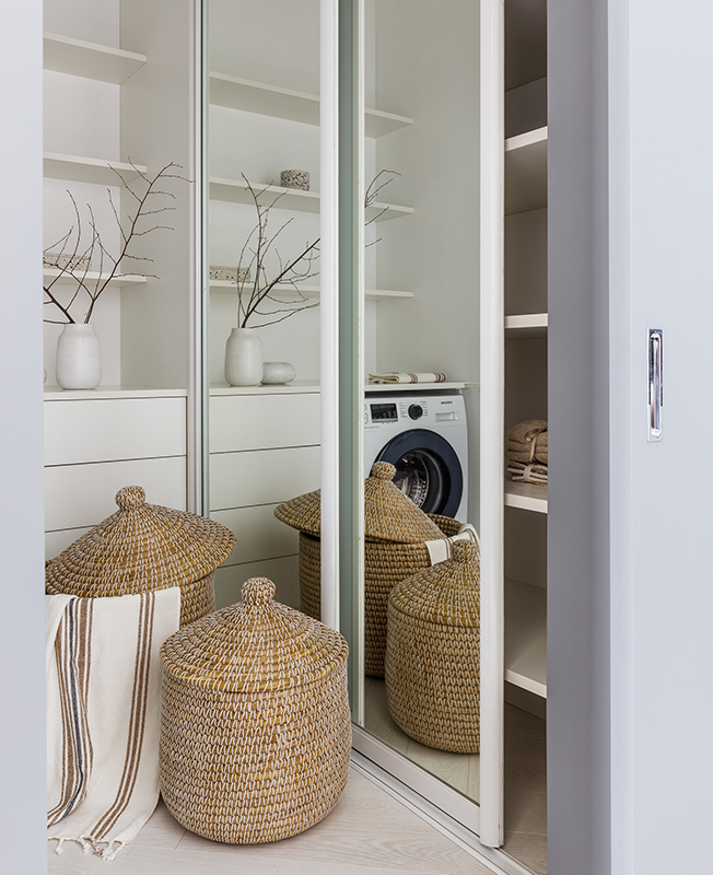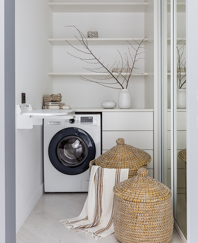 Главной задачей было эргономично использовать пространство, чтобы вписалось все, что нужно для комфортного проживания семьи на отдыхе. Зона гостиной запланирована у окна с выходом на балкон и прекрасным видом на море. Гостиная совмещена с полноценной кухней, здесь же раскладной диван, стол-трансформер. Есть отдельное помещение под гардеробную с прачечной, вход в которую замаскирован дверью со скрытым коробом и окрашен в серый цвет стен. Спальня расположена справа от входа в нише и отделена от коридора легкой шторой. Ванная комната минимальных размеров оформлена в графитных тонах, как весь интерьер.