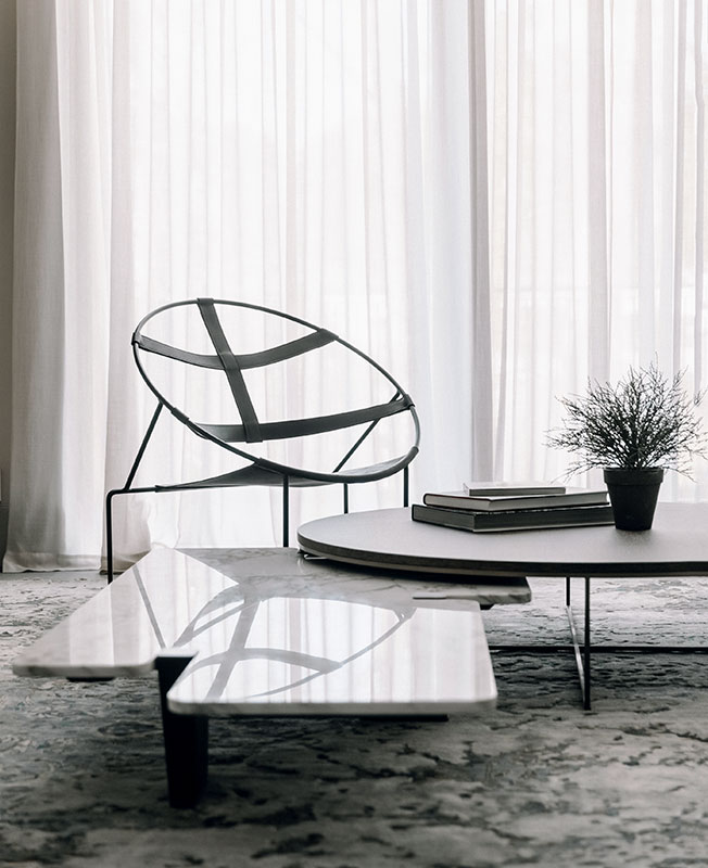 Из интересных находок в интерьере — кресло FDC1 — эксклюзивный и редкий предмет мебели, спроектированный бразильским художником Флавиу де Ресенде Карвалью (1899–1973) в 50-х годах. Это скульптурное кресло — один из шедевров дизайнера, которого Ле Корбюзье считал «романтическим революционером». Форма кресла впечатляет своей графикой.