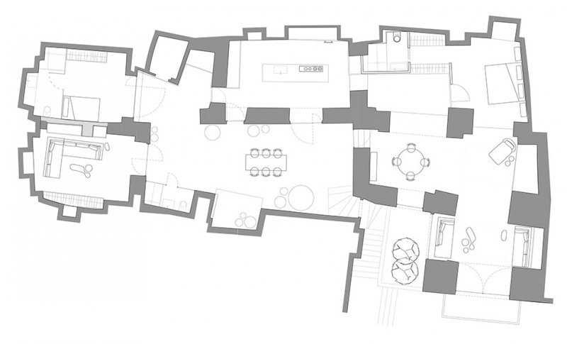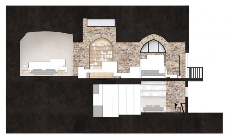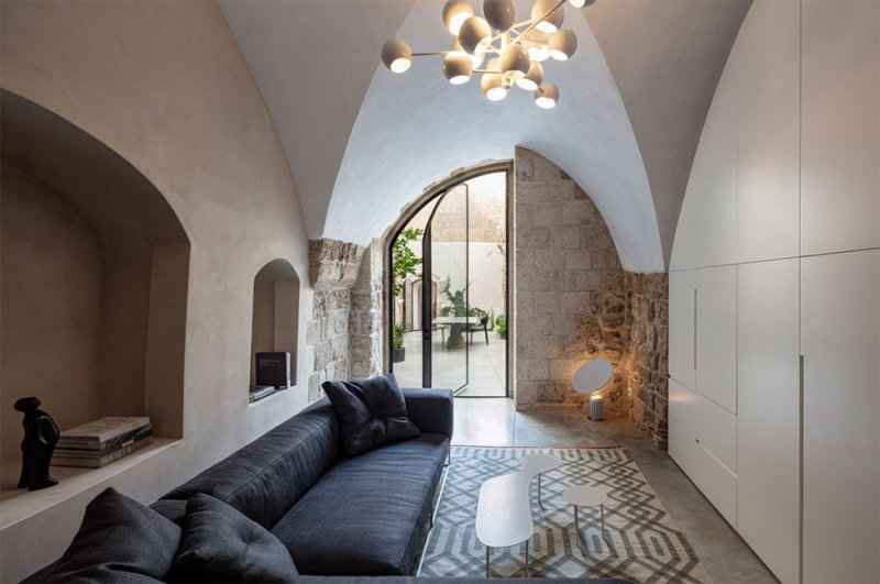 Студия из Тель-Авива Pitsou Kedem уже имела опыт по преображению подобных пространств. Клиенты хотели сохранить уважение к историческим камням, но создать современный благоустроенный дом. В течение нескольких месяцев шли работы по восстановлению первоначальных каменных поверхностей, их обработке для того, чтобы предотвратить последующие повреждения.
