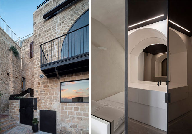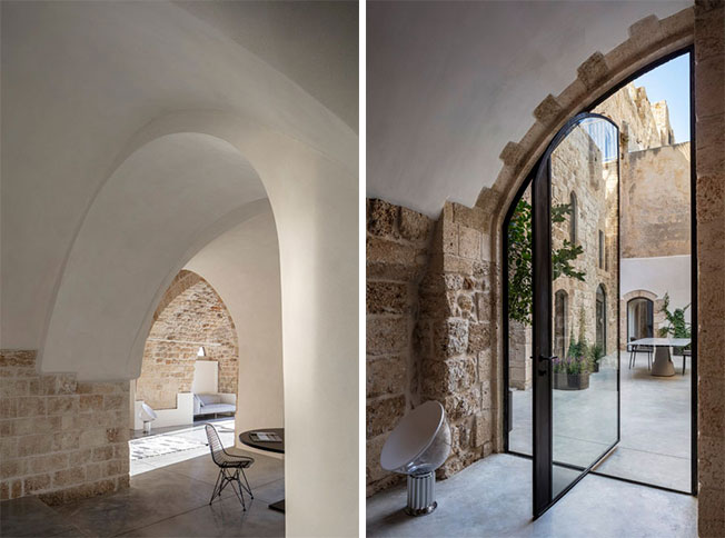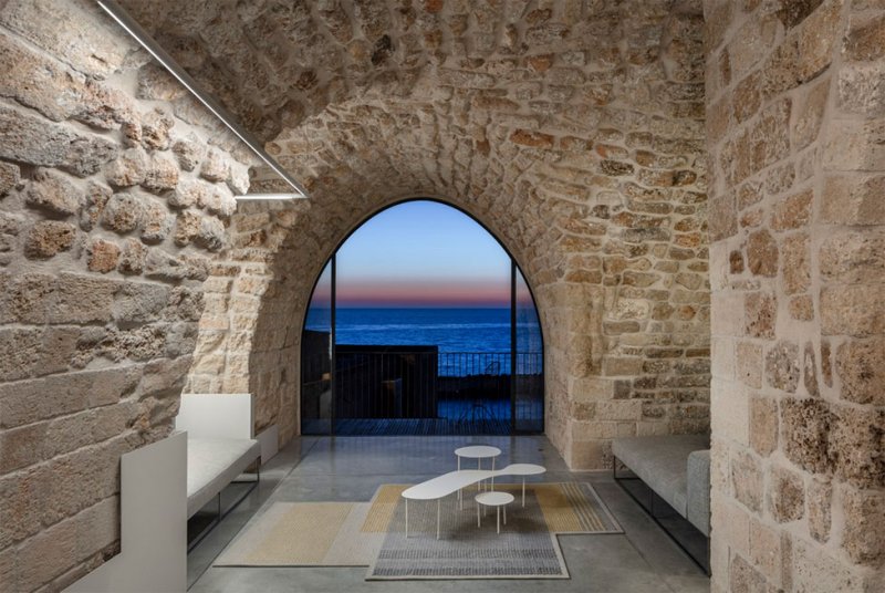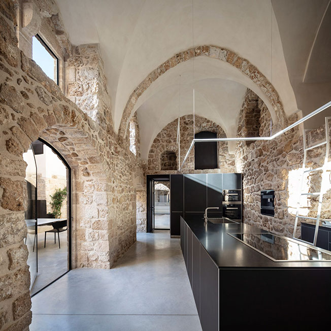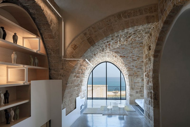 Старые каменные стены вместе с большими арочными проемами служат фоном для череды комнат в этой квартире, которая отремонтирована архитекторами Pitsou Kedem в Яффе. Апартаменты с видом на море расположены в 300-летнем здании в старом портовом районе, известном своими извилистыми мощеными улочками и шумным блошиным рынком. Со времени постройки объект претерпел только одну серьезную реконструкцию, в комнатах были частично разрушены кирпичные стены и повреждены полы. Студия из Тель-Авива Pitsou Kedem уже имела опыт по преображению подобных пространств. Клиенты хотели сохранить уважение к историческим камням, но создать современный благоустроенный дом. В течение нескольких месяцев шли работы по восстановлению первоначальных каменных поверхностей, их обработке для того, чтобы предотвратить последующие повреждения. Некоторые стены частично закрыты тонкими белыми листами металла, за которыми идет элекрическая проводка, системы кондиционирования воздуха и некоторые шкафы для хранения. Несколько существующих арочных проемов оставлены как есть, без дверей. Для того, чтобы, например, отделить спальню достаточно тканевого занавеса. Окна и двери выполнены из стекла в бронзовой оправе, большинство из них закреплены на центральной оси. Их можно вращать — в жаркие дни приятно впустить в дом прохладный морской бриз. Стеллажи из дерева были встроены в сводчатые ниши. Кухня укомплектована современной сантехникой с матово-черной отделкой и серебристо-металлической техникой. Дом выходит в большой внутренний двор, покрытый ползучими растениями. Его, в теплые летние месяцы, можно использовать в качестве дополнительной столовой на открытом воздухе.