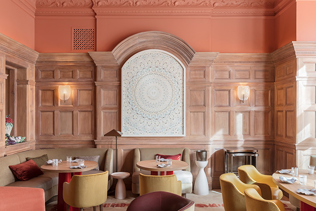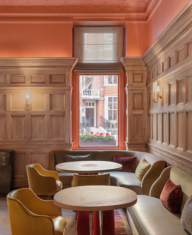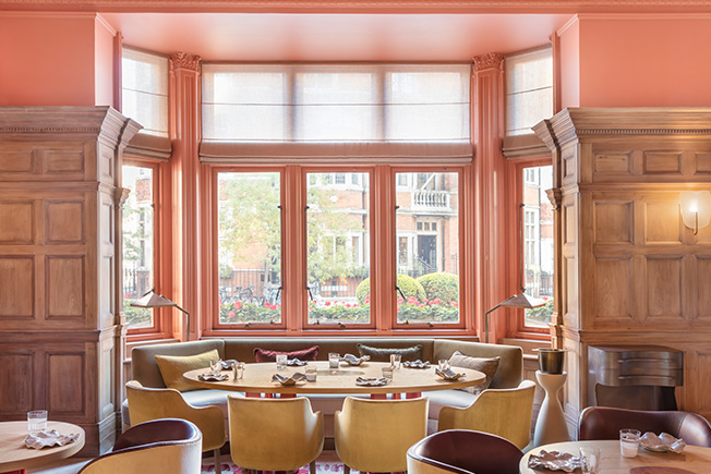 Параллельно, уважая исторический контекст, парижский дизайнер стремился найти баланс между традицией и современностью. Осветляя существующие панели из темного дерева, окрашивая старую штукатурку в теплый розовый градиент и устанавливая изогнутую и выразительную мебель, Йованович балансирует между игривой женственностью и классическим английским характером Connaught, отеля, входящего в Maybourne Hotel Group.