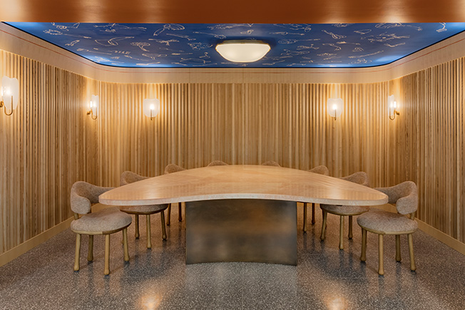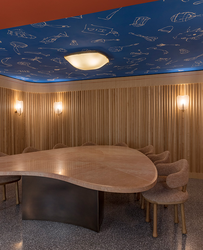 В дополнение к основному обеденному залу, Пьер Йованович и его команда спроектировали пространство шефа — Chef's Table с полами терраццо, современными панелями из светлого дуба и потолочной фреской, созданной художником Рошегауссеном. Стулья вместе со столом, украшенным розовой мраморной столешницей и патинированной металлической основой, были спроектированы лично Йовановичем. Бра — от Маттео Гоне.