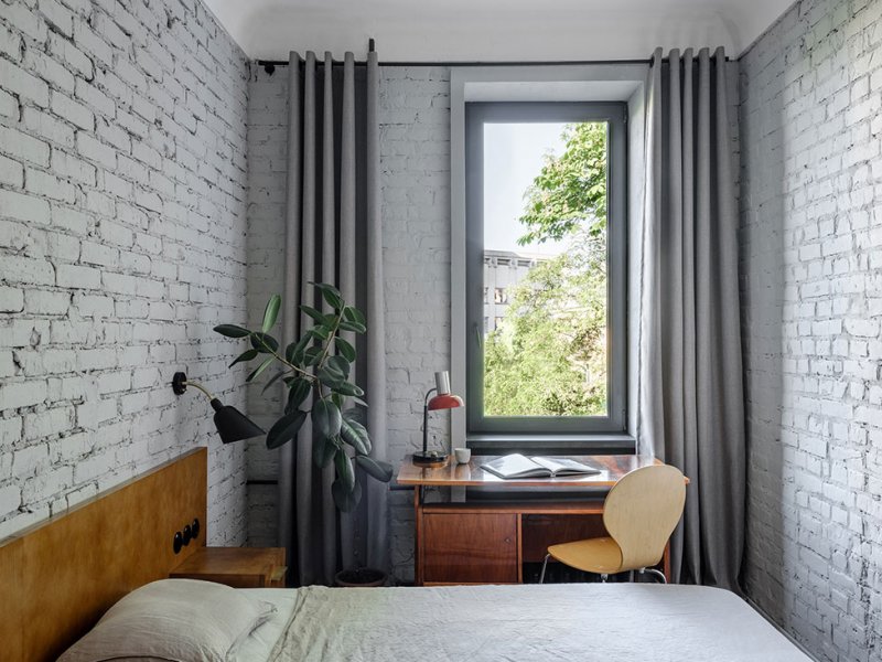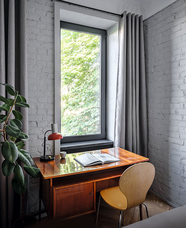 Поверхности стен оставили в голом кирпиче — такая отделка перекликается с фасадом, — а потолки подновили с помощью штукатурки, изготовленной по старой методике. Мебель в основном родом из cередины ХХ века. Найденный на барахолках советский винтаж архитектор соединил с классикой от Жана Пруве и Арне Якобсена.