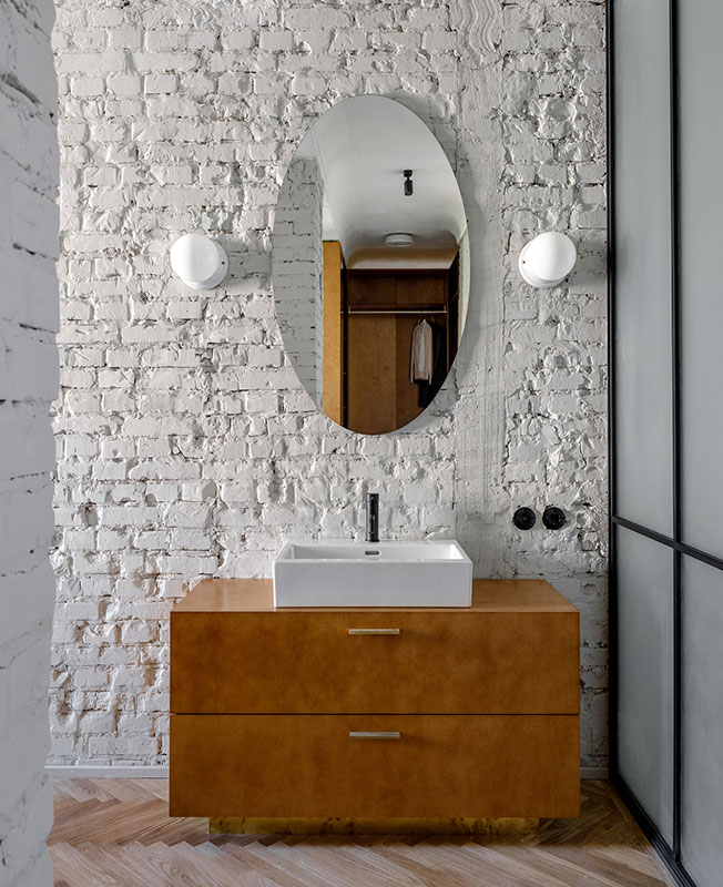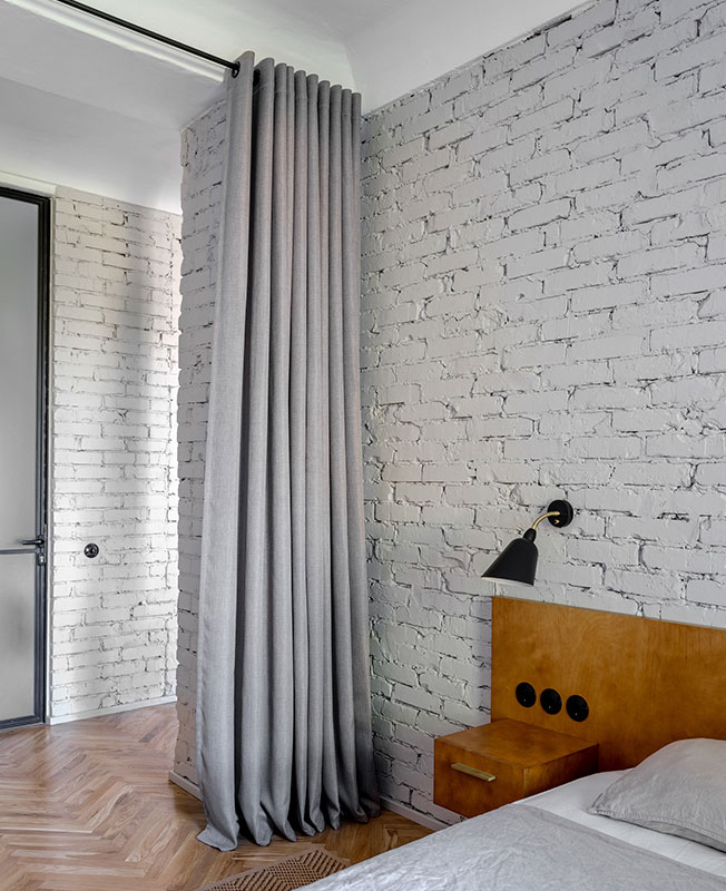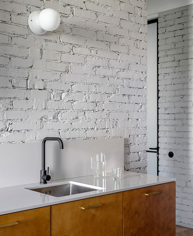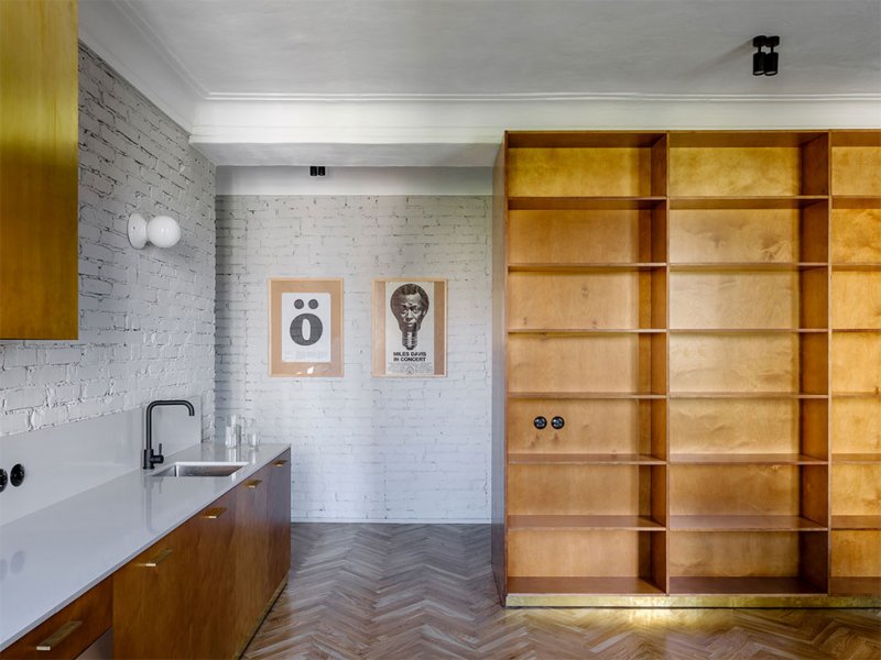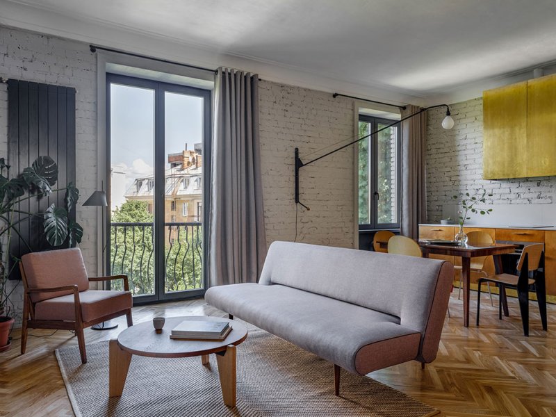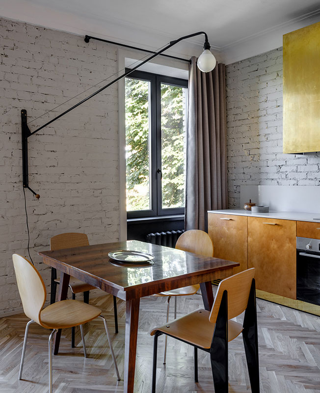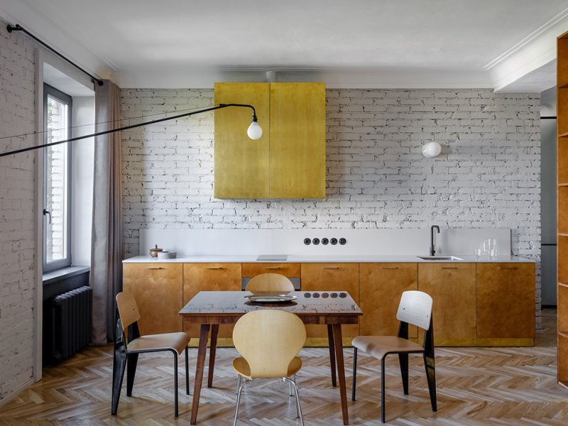Архитектор Эмиль Дервиш реконструировал квартиру в историческом центре Киева. В доме 1950-х создал современную планировку, но с атмосферой времени постройки. nonehttps://www.instagram.com/emildervish/nonehttps://emildervish.com/ В квартире не было ремонта с 1950-х годов. И это, как ни странно, автор проекта Эмиль Дервиш считает главным достоинством исходника: в нем сохранились потолки с характерными для того периода карнизами, старые радиаторы. Заказчик — молодой, много путешествующий человек — мечтал о квартире, которая передает дух Киева и времени, в котором построен дом. Дом расположен на Рейтарской улице в историческом центре Киева, окна выходят в тихий двор. «Мне хотелось выполнить эту задачу без искусственной стилизации, функциональными средствами: с помощью материалов, характерных элементов мебели и освещения», — говорит архитектор. Прежнюю планировку — три комнаты с длинным темным коридором — Дервиш радикально изменил: демонтировал все перегородки, и теперь здесь только одна стена, которая отделяет просторную студию от спальной зоны. Кухня-гостиная. Кухня-гостиная. Кухня-гостиная. Спальня. Поверхности стен оставили в голом кирпиче — такая отделка перекликается с фасадом, — а потолки подновили с помощью штукатурки, изготовленной по старой методике. Мебель в основном родом из cередины ХХ века. Найденный на барахолках советский винтаж архитектор соединил с классикой от Жана Пруве и Арне Якобсена. Кухонный шкаф, где прячутся вытяжка и проектор, также из латуни. Стол: советский винтаж. Стулья, диз. Жан Пруве, Vitra. Г-образный мебельный шкаф с внешней стороны работает как стеллаж в гостиной и шкаф в холле, а изнутри создает гардеробную комнату. Он изготовлен из бюджетного материала — фанеры, но благодаря удачно подобранной тонировке и деталям из латуни выглядит дорого. Спальня. Кровать изготовлена на заказ. Прикроватный светильник, диз. Арне Якобсен,