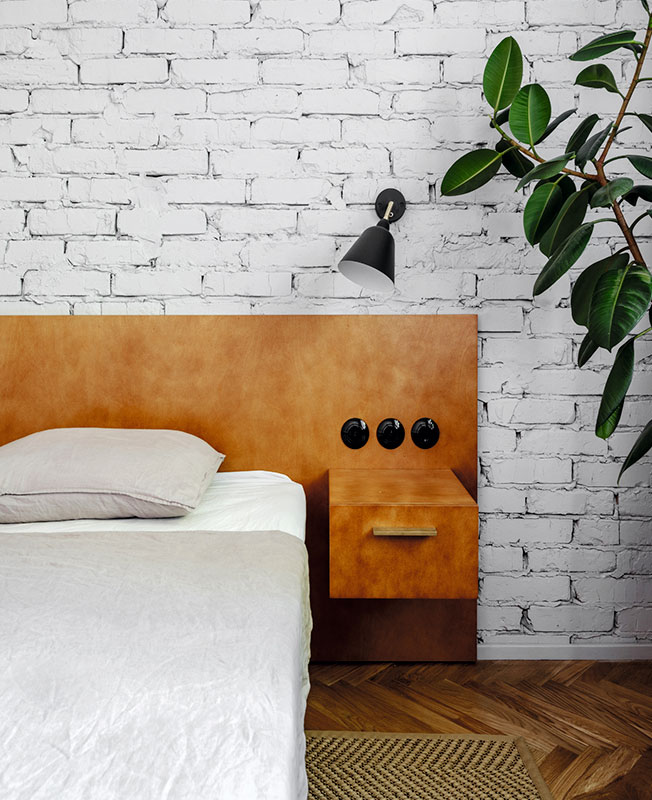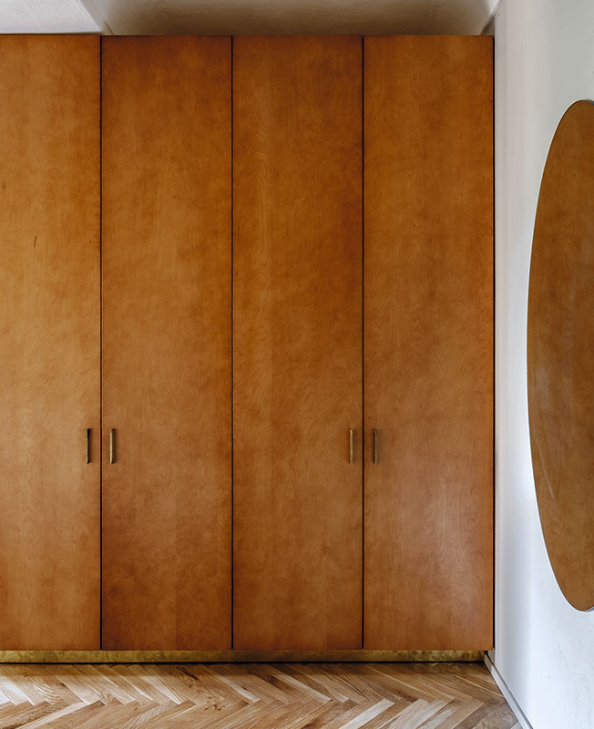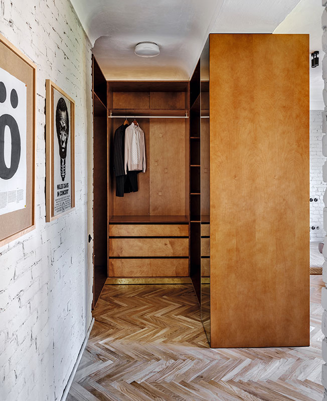 Г-образный мебельный шкаф с внешней стороны работает как стеллаж в гостиной и шкаф в холле, а изнутри создает гардеробную комнату. Он изготовлен из бюджетного материала — фанеры, но благодаря удачно подобранной тонировке и деталям из латуни выглядит дорого.