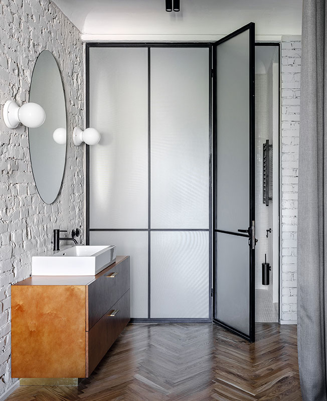 Тумба под раковину изготовлена на заказ. На полу, как и во всей квартире, дубовый паркет, уложенный елочкой.