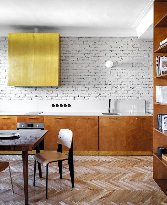 Кухонный шкаф, где прячутся вытяжка и проектор, также из латуни. Стол: советский винтаж. Стулья, диз. Жан Пруве, Vitra.