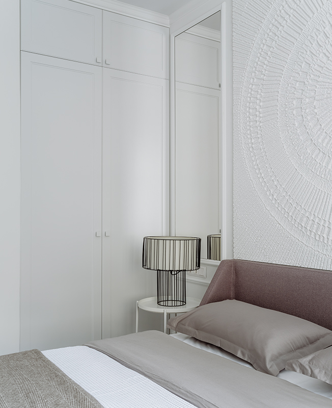 Спальня. Кровать и шкафы изготовлены на заказ. Прикроватные столики Ikea. За изголовьем гипсовый барельеф, молдинги «Европласт». Краска Little Greene.
