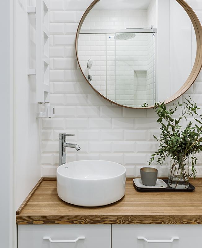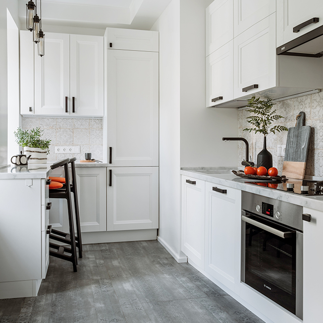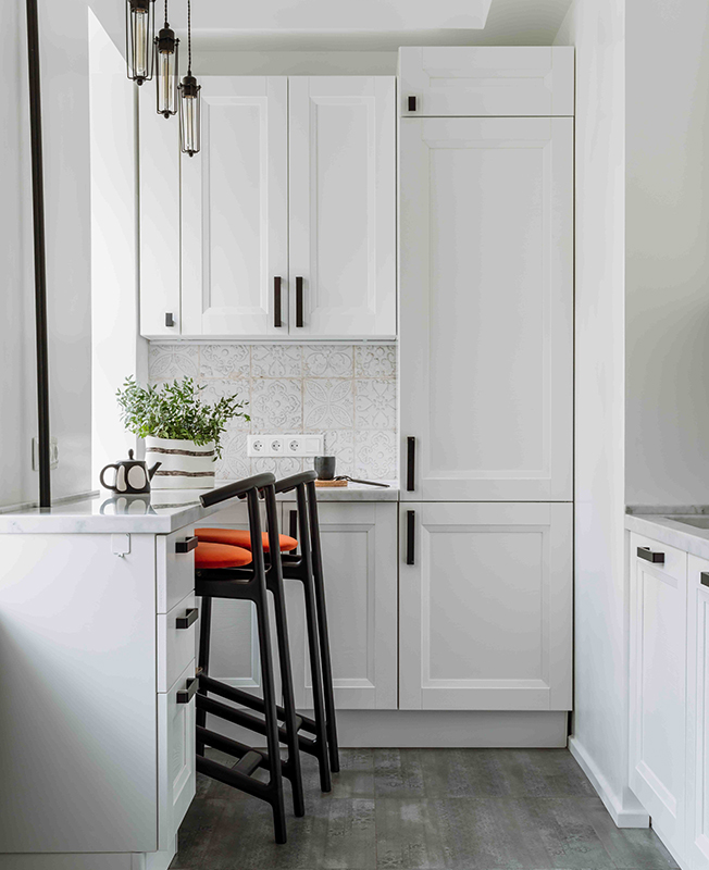 Перепланировка была необходима. Мы решили увеличить кухню, присоединив к ней площадь ванной команты. А чтобы все манипуляции с квартирой были законными, на территории кухни оставили технику, а в зону ванной вынесли рабочую поверхность и барный стол. После перепланировки была организована прихожая, гостиная, душевая, кухня, спальня и комната под будущую детскую.