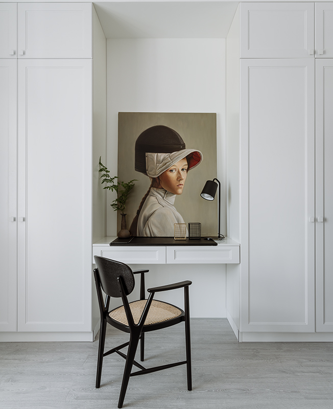 Спальня. Шкафы изготовлены на заказ. Стул Unika Moblar. Настольная лампа Barcelona Design. Картина «Присутствие» — Анастасия Копытцева.