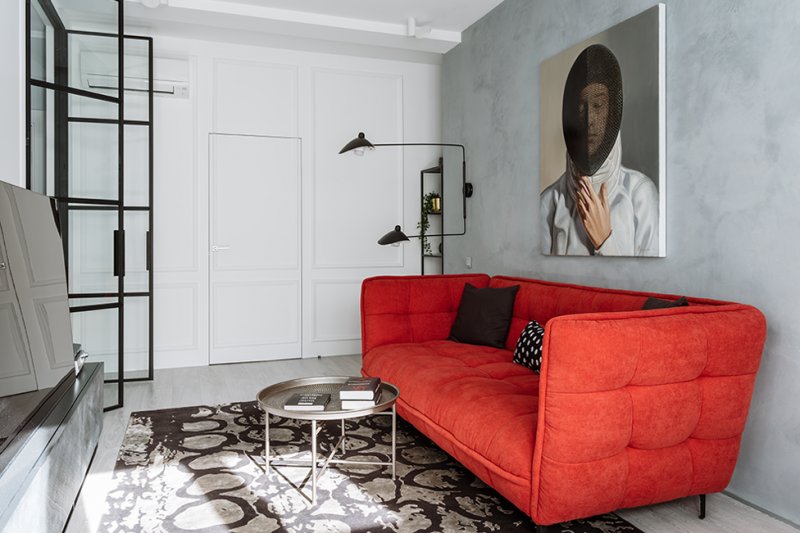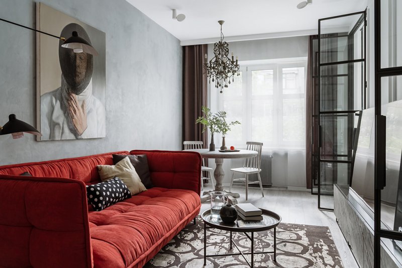В основе палитры спокойные тона, разбавленные контрастными акцентами. Красный диван в гостиной «держит» интерьер комнаты, не давая ему рассыпаться на осколки серых оттенков. Чтобы интерьер смотрелся живо и динамично, добавлены черные детали: металлические перегородки, ручки на фасадах кухни и дверях, в черный выкрашены все трубы и радиатор, стулья — с черным каркасом. Во время ремонта появился сюрприз в виде трубы на кухне, которая обнаружилась во время демонтажа стены. Решили не зашивать в короб, а тоже покрасить в черный цвет. Прием сработал.