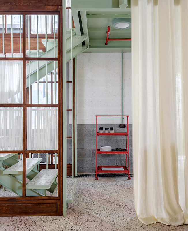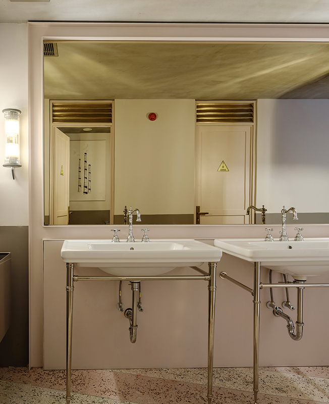 Использовались такие материалы, как терраццо, латунь, мрамор, металл, натуральная древесина, лен и бетон, который, по мнению авторов проекта, придает интерьеру немного брутальности и в то же время выглядит актуально и стильно — в духе современных тенденций.
