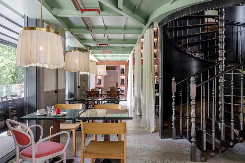 Дизайнер Эсма Хецуриани и Лали Папашвили, креативный директор консалтингового агентства Gastronaut, разработали интерьер кафе-кондитерской «Пури Гулиани» в Тбилиси. Современные лаконичные элементы соединили с типичными штрихами местной архитектуры. Название пекарни восходит к истории грузинских традиций выпечки. «Пури Гулиани» — это «сердечный хлеб» или «хлеб с сердечком (начинкой) внутри», распространенный по всей Грузии. Основной идеей было создать грузинскую пекарню нового поколения, основанную на сочетании старых кулинарных традиций и современных гастрономических тенденций, где уже знакомые, а также почти забытые грузинские вкусы и ингредиенты возрождаются вновь интересными и современными способами. nonehttps://www.instagram.com/gastronaut.ge/https://www.facebook.com/gastronautgehttps://www.gastronaut.ge/ «Пури Гулиани» расположена на уютной площади с видом на реку Куру и гору Мтацминда, в одном из старейших районов Тбилиси, в котором ностальгические эпизоды грузинской культуры соседствуют с современными чертами города. Ресторан пекарни работает в течение всего дня, что раньше не было распространено в Тбилиси: люди могут приходить в любое время — на завтрак, бранч, обед или ужин. Концепция интерьера отсылает к историческим районам XIX века, таким как Плеханови: с их уникальными двориками, винтовыми лестницами, балконами и другими типичными элементами архитектуры. Воспоминания о Советском Союзе также играют свою роль — некоторые элементы были взяты с близлежащего хлебозавода, построенного в 1950-х годах. Пекарня площадью 345 кв. метров занимает два уровня. На первом этаже находятся три входные зоны с живописной террасы, главный зал, стойка обслуживания, где главным арт-объектом стала профессиональная кофемашина Slayer, и открытая кухня с витринами от итальянского бренда IFFI, наполненными сладостями. Один из центральных элементов первого этажа — огромная металлическая печь, в которой ежедневно выпекаются хачапури и другая грузинская выпечка, которая находится на виду у гостей. Главная гордость в интерьере — винтовая лестница, своего рода художественная инсталляция, соединяющая первый и второй этажи. Большая часть мебели и освещения была разработано Эсмой и изготовлена вручную местными мастерами, как и предметы декора, такие как керамические тарелки, в основном разработанные Лали. Стулья и столы выбрали бренда TON. Столовые приборы и кофейные кружки — Guy Degrenne. В основе палитры — пудровые оттенки. Использовались такие материалы, как терраццо, латунь, мрамор, металл, натуральная древесина, лен и бетон, который, по мнению авторов проекта, придает интерьеру немного брутальности и в то же время выглядит актуально и стильно — в духе современных тенденций.